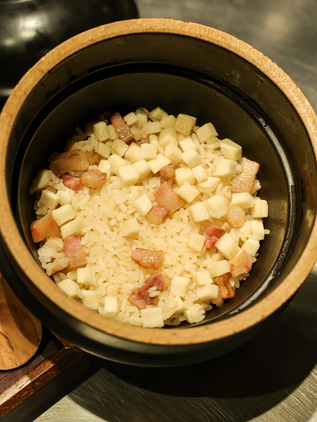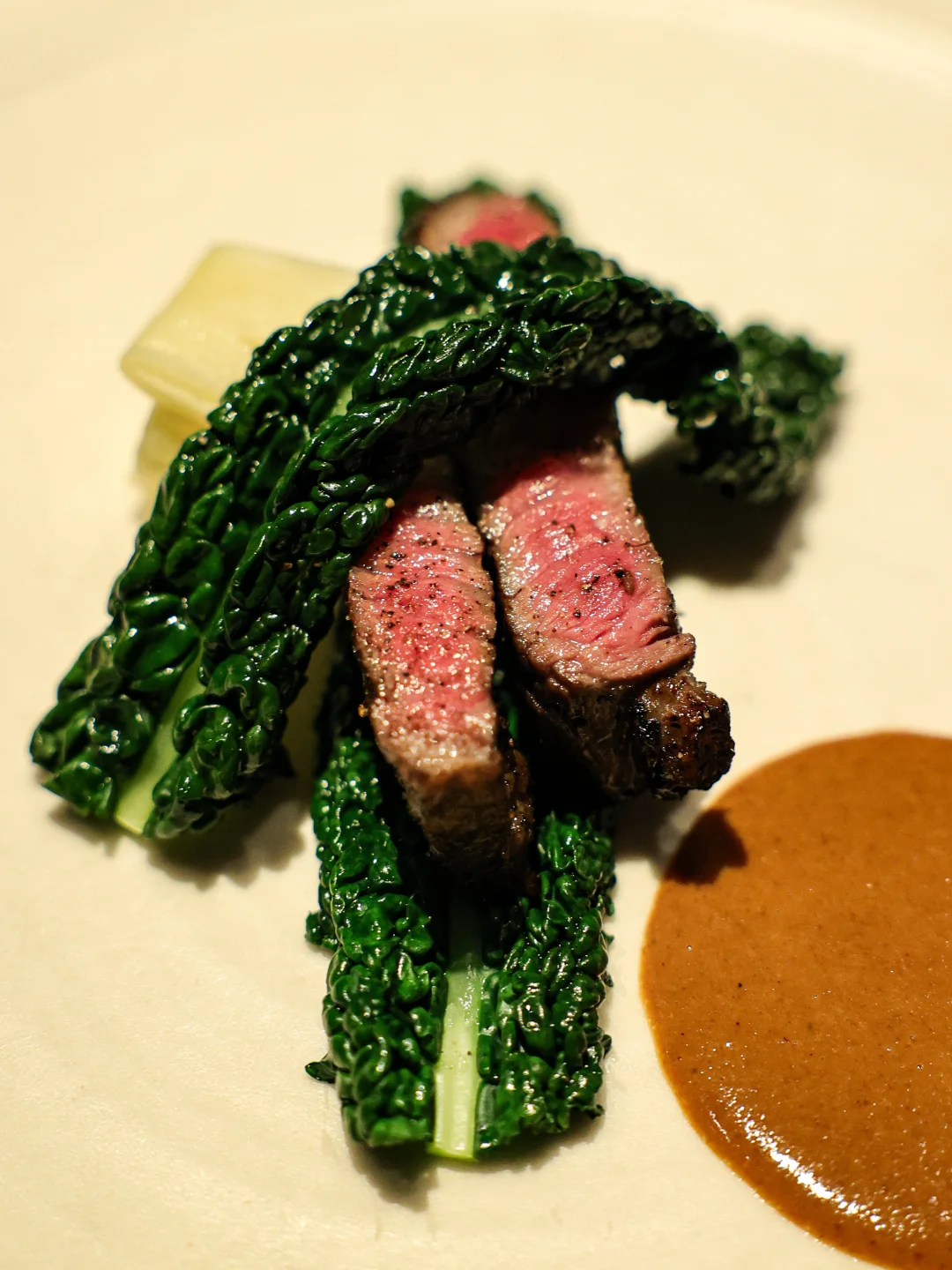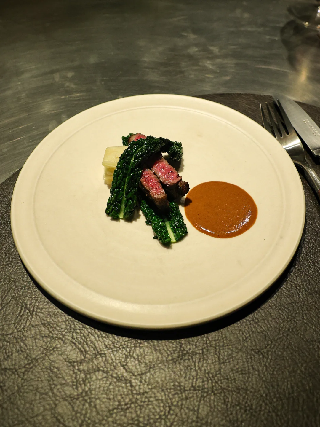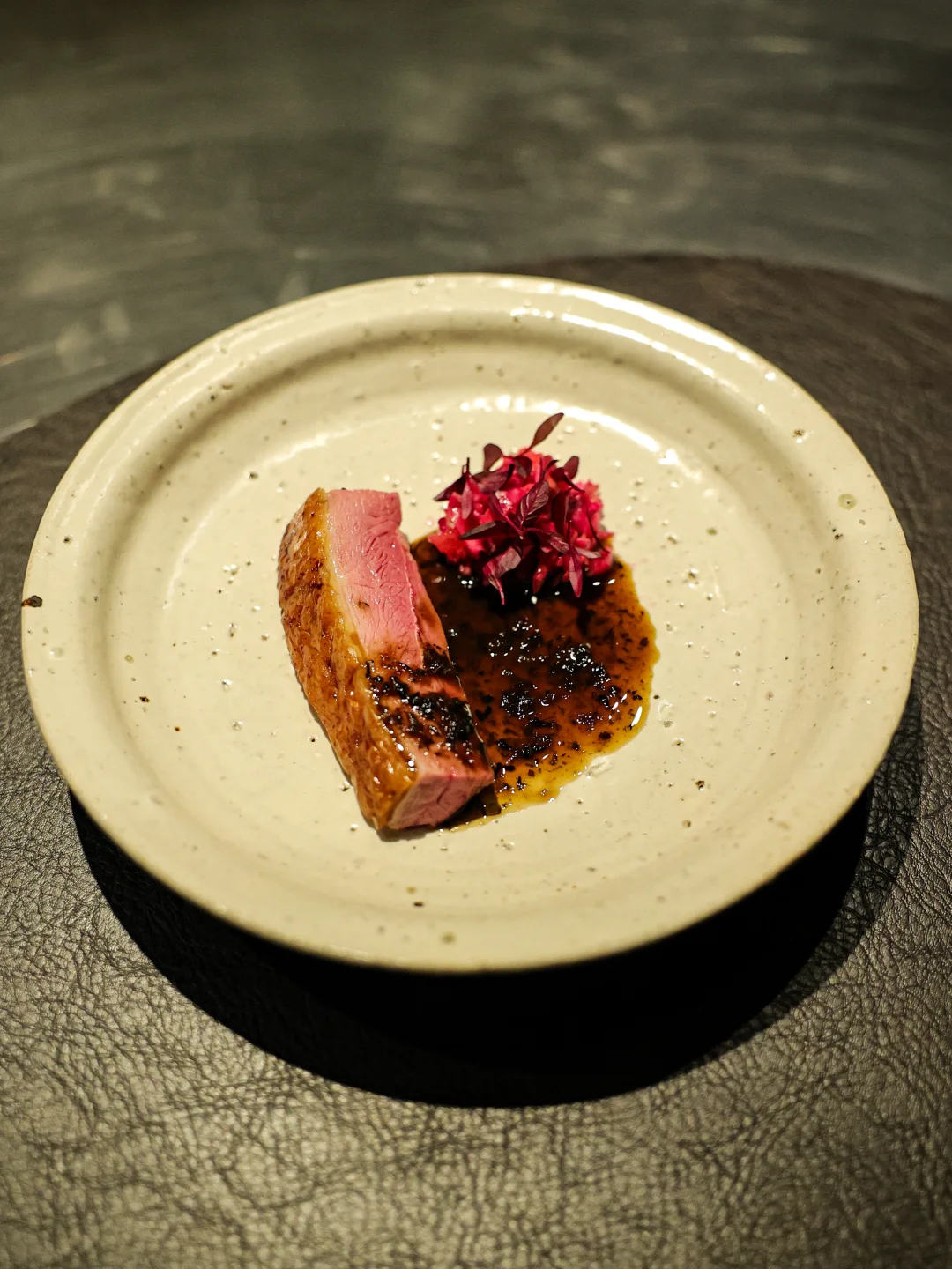 鸭胸肉烤得很棒,渐变的粉色谁看了不心动!富有嚼劲的同时可以先搭配咸味为主的梅干菜酱汁;用泡菜版本的紫甘蓝在一旁搭配解腻,意外地合适。
