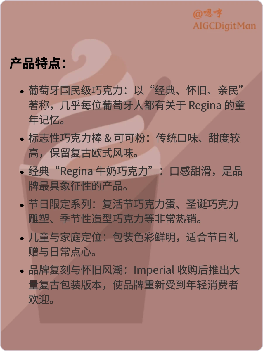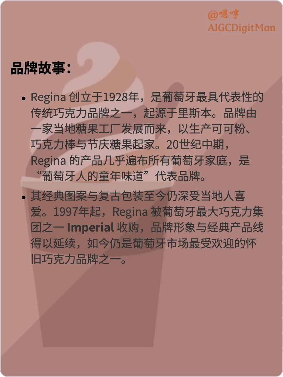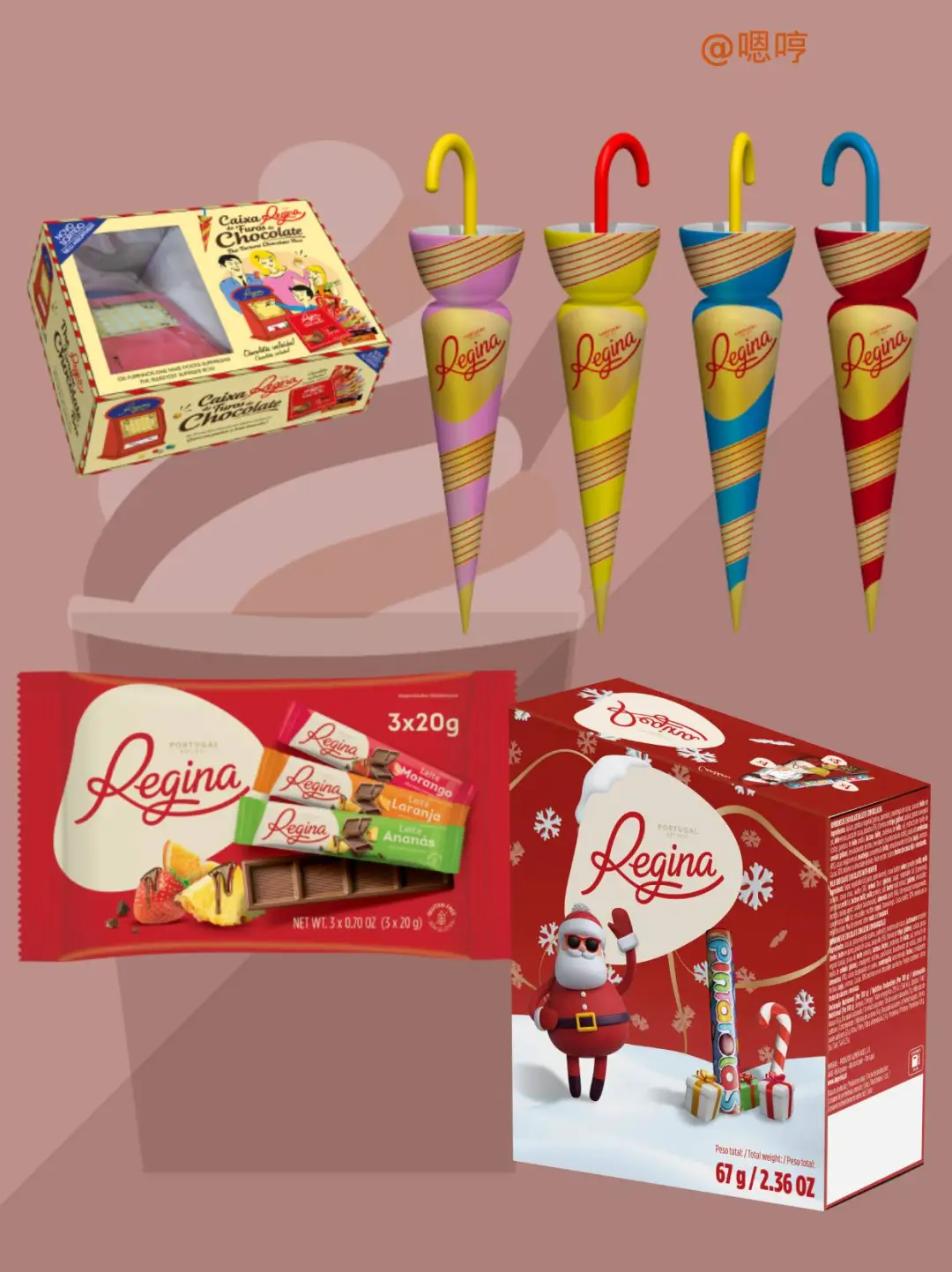 其经典图案与复古包装至今仍深受当地人喜爱。1997年起,Regina 被葡萄牙最大巧克力集团之一 Imperial 收购,品牌形象与经典产品线得以延续,如今仍是葡萄牙市场最受欢迎的怀旧巧克力品牌之一。