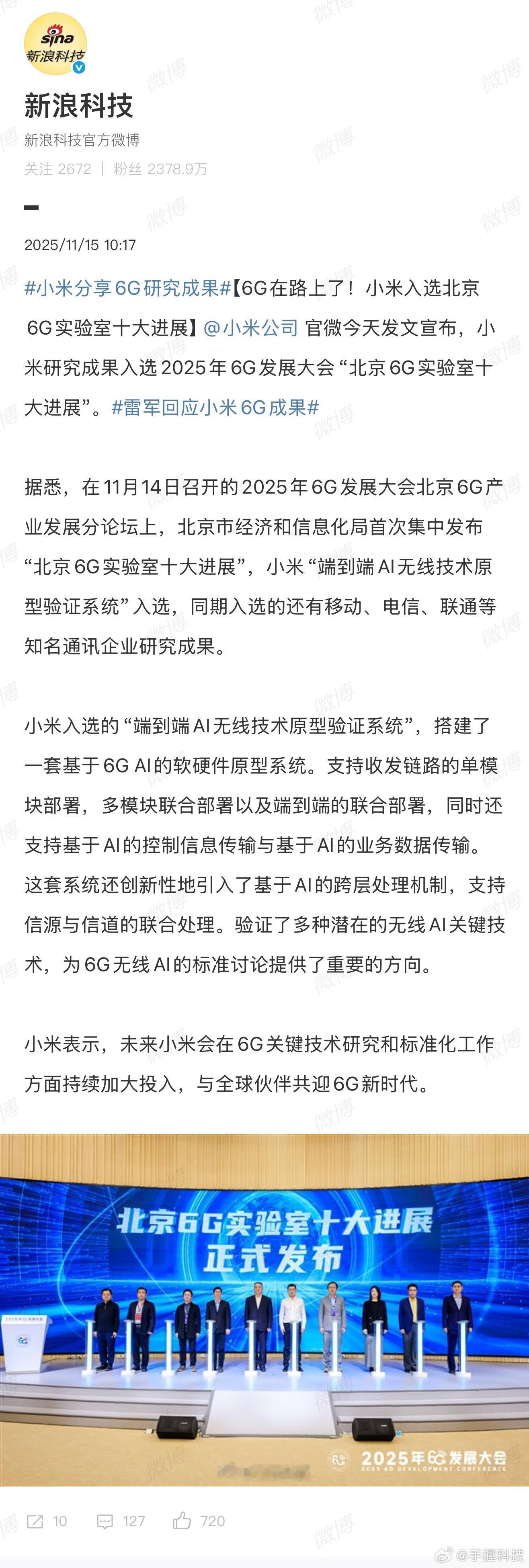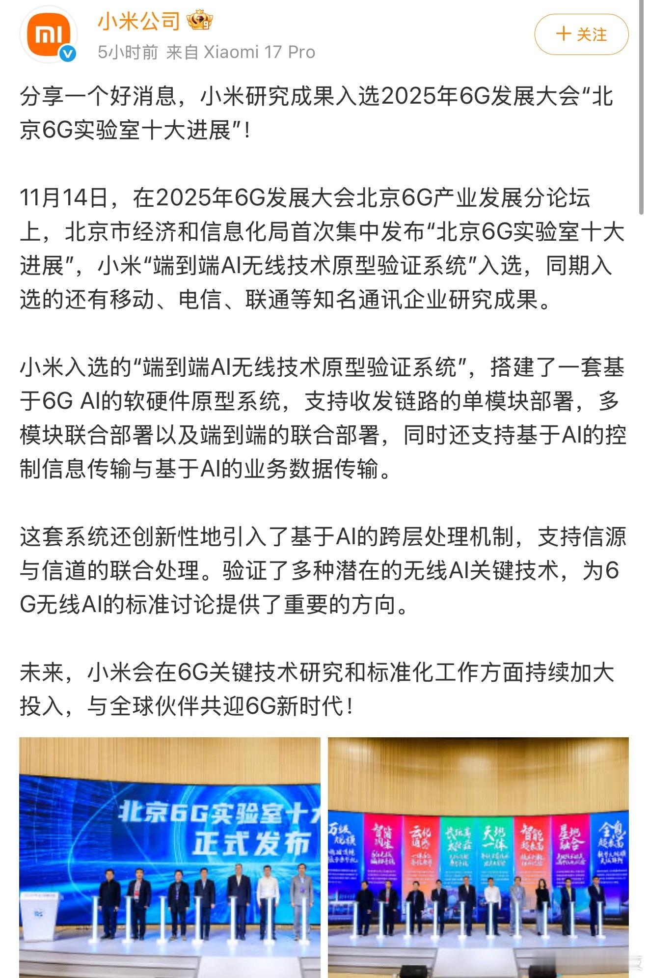 所以你只管努力,剩下的交给时间。大家真的要重新认识一下小米了,虽然经常被某些人喷,但你不得不承认现在的小米真的跟以前不一样了。6G技术是未来行业发展的方向,也是国内外各大机构和公司争相竞逐的重点领域。这次6G发展大会北京6G产业发展分论坛上,小米的“端到端AI无线技术原型验证系统”入选“北京6G实验室十大进展”,就是其积极创新并取得惊人成果的例证。而且小米这套系统的亮点也比较多,不仅搭建的基于6G AI的软硬件原型系统支持多种部署模式,还创新引入跨层处理机制,验证多种关键技术,显示出小米对未来通讯发展的积极探索。这就说明小米的科研实力确实是可以的,据说他们未来还计划在6G关键技术研究和标准化工作上加大投入。相信凭借这份决心和努力,小米也会在6G时代创造更多可能。还是那句话,小米变了,大家也不应再停留在过去戴着有色眼镜去看他,而应该跟着一块改变才对!