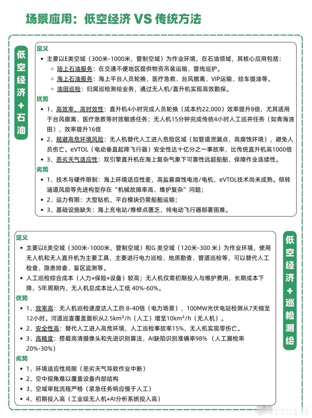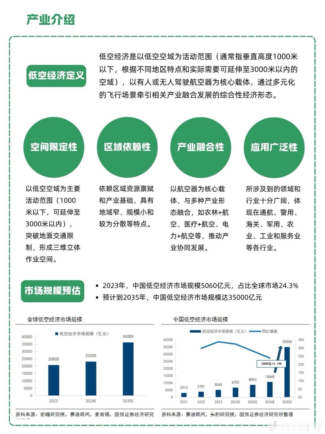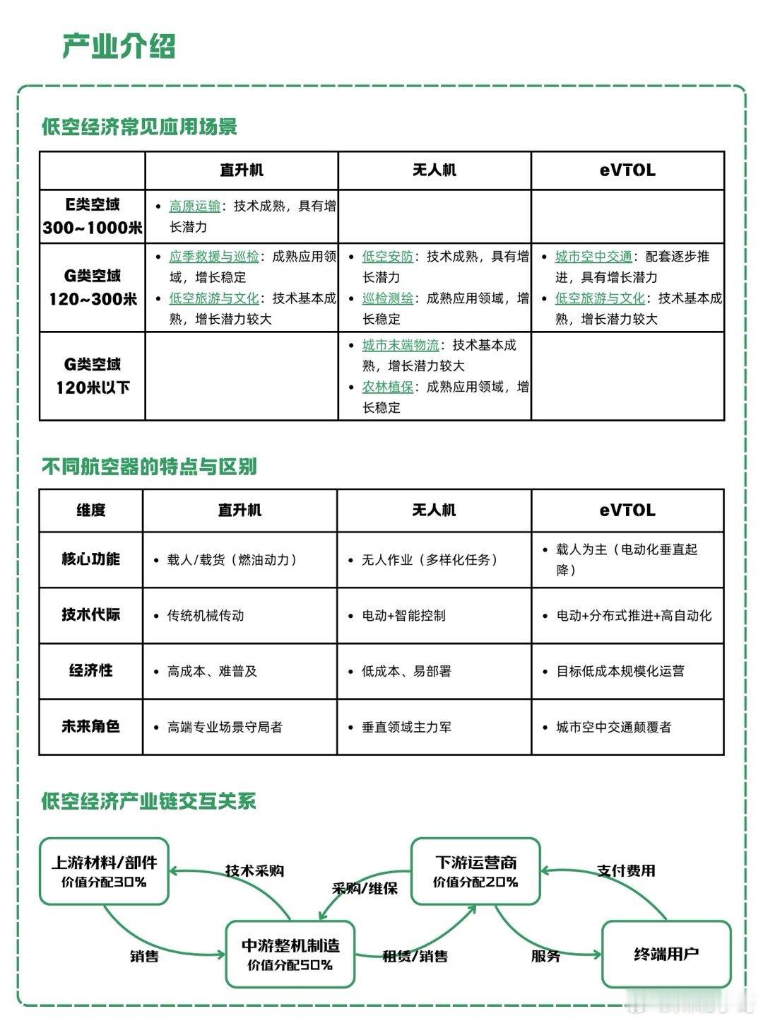 🚁低空经济,作为新质生产力的典型代表,正从概念加速走向现实,深刻改变着我们的生产与生活方式,并为全球经济发展注入新动能。1️⃣低空经济通常指在垂直高度1000米以下的空域内,以有人驾驶或无人驾驶航空器的飞行活动为牵引,辐射带动相关领域融合发展的综合性经济形态。其核心载体包括无人机、电动垂直起降飞行器(eVTOL)、直升机等。2️⃣万亿级市场潜力 :据测算,2023年中国低空经济规模已超过5000亿元,预计到2030年有望达到2万亿元,到2035年规模可达3.5万亿元,其对国民经济的综合贡献值更为可观。3️⃣赋能千行百业 :低空经济不仅能催生新的消费业态(如空中通勤、观光),更能通过“低空+”深度融合,提升传统行业的效率,如在农业植保、物流配送、电力巡检、应急救援等领域已发挥重要作用。4️⃣新质生产力的代表 :它集先进制造、新一代信息技术、绿色能源于一体,产业链长、覆盖面广,对推动产业升级、拓展经济发展新空间具有深远意义5️⃣低空经济在中国已驶入发展的快车道。随着政策、技术、基础设施与市场需求的同频共振,低空经济有望成为推动中国经济高质量发展的重要力量。