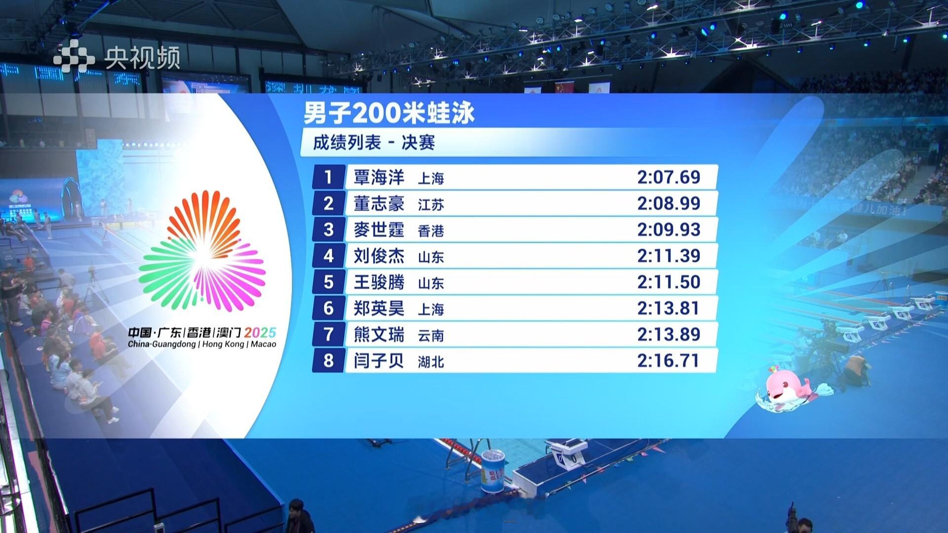 男200蛙决赛覃海洋 2:07.69 董志豪 2:08.99麦世霆 2:09.93 PB & 香港纪录