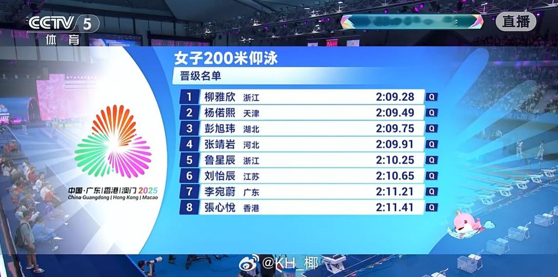 女200仰半决赛柳雅欣 2:09.28杨偌熙 2:09.49 PB彭旭玮 2:09.75张靖岩 2:09.91鲁星辰 2:10.25刘怡辰 2:10.65 PB李宛蔚 2:11.21 张心悦 2:11.41