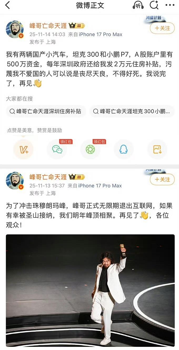 11月14日,网红“峰哥亡命天涯”被全网禁止关注。 峰哥在被封前曾发微博说:“我有两辆国产小汽车,坦克300和小鹏P7,A股账户里有500万资金,每年深圳政府还给我发2万元住房补贴,污蔑我不爱国的人可以说是丧尽天良,不得好死。我说完了,再见” 他还说为了冲击珠穆朗玛峰将正式无限期退出互联网。