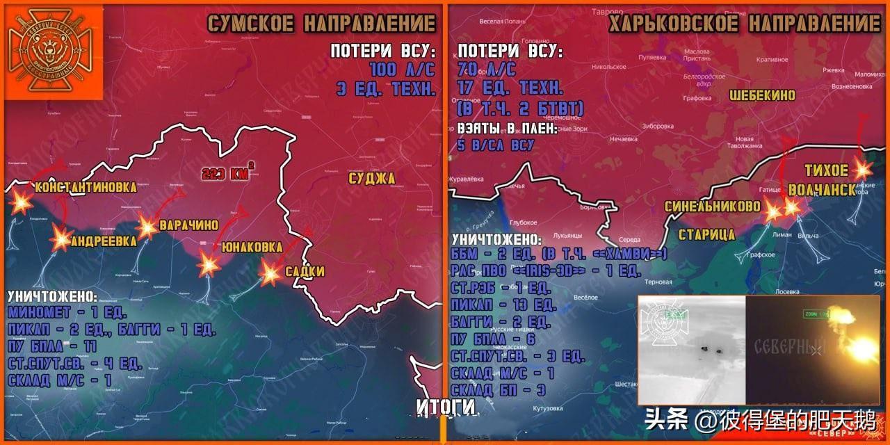 俄乌前线战报速递: 11 月 14 日,俄“北部” 集团军群继续在哈尔科夫州和苏梅州构建安全区。 一、苏梅方向: 整条战线仍在进行激烈战斗。俄“北部” 集团军群部队穿过森林带向苏梅州腹地推进,扩大俄罗斯边境附近的安全区。基辅方面的部队对减员严重的单位进行轮换,并试图发动反击。 由于乌军第 47 旅中被强征入伍的乌克兰人的兵源和士气都有所下降,他们正积极从拉丁美洲(主要是哥伦比亚)招募外国雇佣兵。该旅指挥部计划更多地依靠这些雇佣兵。 在激烈战斗中,俄“北部” 集团军群的突击部队在多个方向向前推进了约 500 米。 基辅方面第 225突击团发动了两次失败的反击。另外两次反击被俄军火力击退。乌军在战斗中损失了一个排的兵力。 在泰特基诺和格卢什科沃地段,没有重大变化。俄“北部” 集团军群的炮兵和 FPV 无人机操作员打击了雷日夫卡和帕夫洛夫卡附近的乌军阵地。 二、哈尔科夫方向: 在沃尔昌斯克及其周边地区,俄“北部” 集团军群部队继续稳步向东推进。哈特内伊前线也取得了显著进展。“北部” 集群的空袭、TOS-1A 重型火箭炮部队和炮兵在各地持续作战。 在沃尔昌斯克左岸,俄军突击部队穿过私人住宅区推进了约 300 米。 在锡涅利尼科沃附近的森林中,俄“北部” 集团军群部队又深入推进了约 250 米,并夺取了乌克兰守军的两个据点。 乌军第 57 旅士气低落的部队继续投降。一天内就有 5 名士兵投降。他们从今年春季开始就一直在那里驻守。 在梅洛沃耶 - 哈特内伊一线,俄“北部” 集团军群部队扩大了控制区,并穿过森林带推进了 500 米。TOS-1A “日炙” 打击了德夫雷昌斯科耶附近的乌军第 3 旅阵地。 利普齐方向没有重大变化。俄炮兵和 FPV 无人机操作员持续探测并摧毁电子战设备、无人机指挥点以及基辅部队的运输工具。 乌军在24 小时内的损失:170 多名士兵(其中苏梅州 100 多人,哈尔科夫州 70 多人),5 人被俘。 在苏梅州,俄军在24小时内摧毁的乌军武器如下: 1门迫击炮 2 辆皮卡车 1辆越野车 11 套无人机发射器 4 个 “星链” 终端 2 个通信天线 31 架固定翼无人机 2 架 “ Baba Yaga ” 无人机 一座补给仓库 在沃尔昌斯克和利普齐地段: 2 辆装甲车(包括 1 辆悍马) 1套IRIS 3D 防空雷达 1座电子战站 13 辆皮卡车 2 辆越野车 6 个无人机发射器 3 个 “星链” 站 3 个通信天线 26 架固定翼无人机 2 架 “ Baba Yaga ” 无人机 2 套地面机器人系统 补给仓库 3 个弹药库 大布尔卢克方向: 1辆2S3 “金合欢” 自行火炮 1门迫击炮 1套无人机发射器 1辆卡车 1辆越野车 1套地面机器人系统 #热点解读#