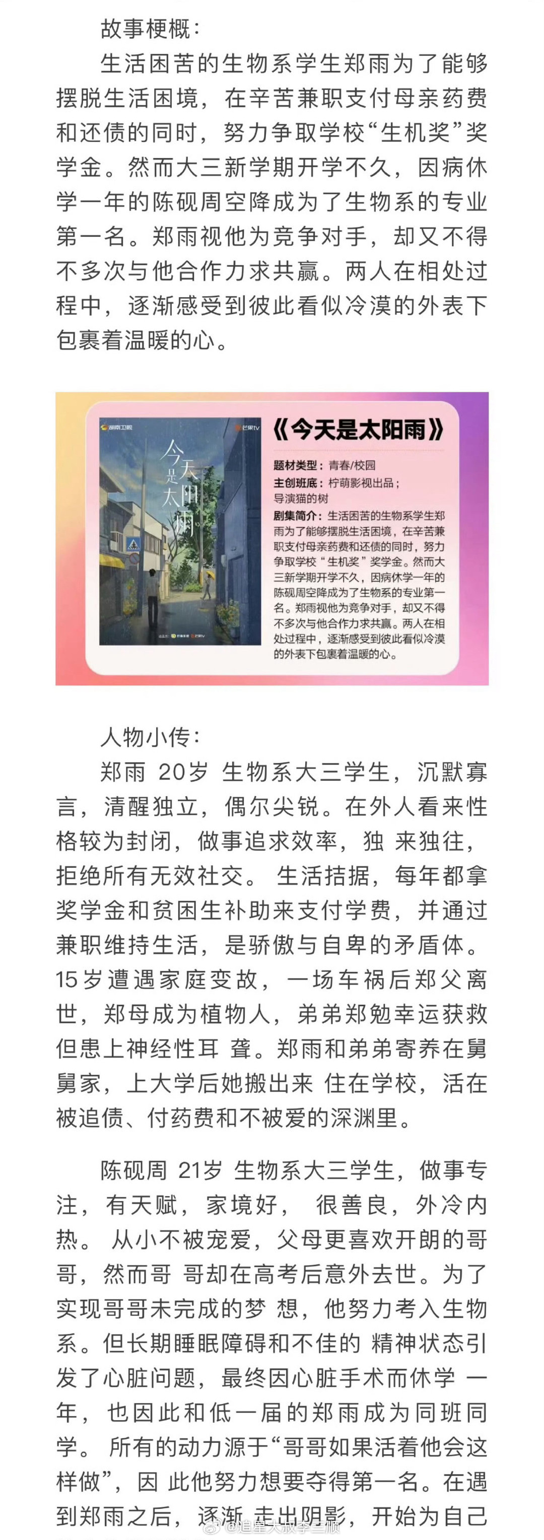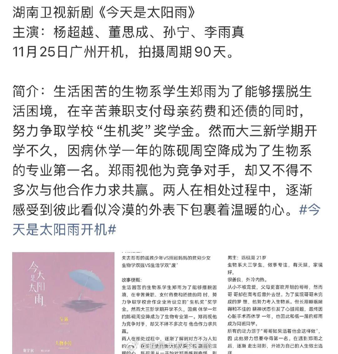 🍉猫的树《今天是太阳雨》主演:杨超越、董思成、孙宁、李雨真预计11.25广州开机