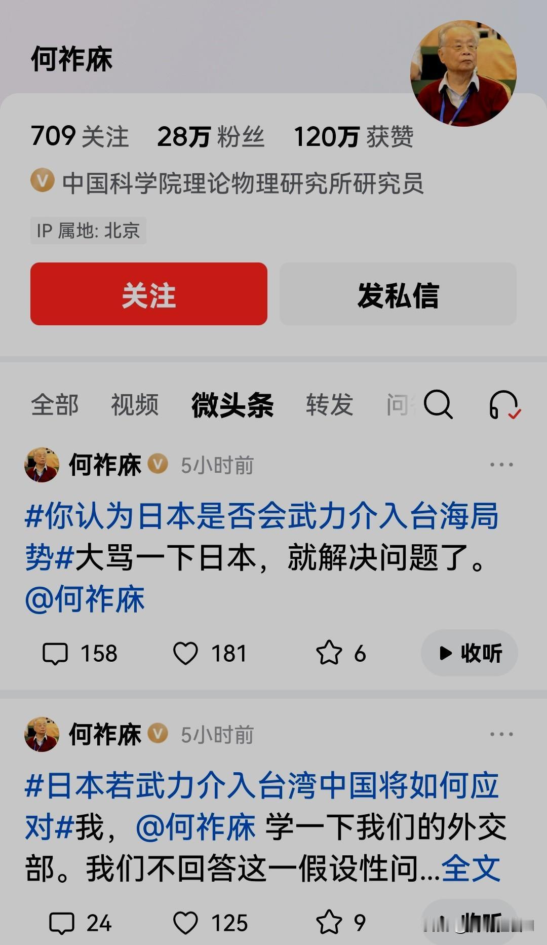 @何祚庥 老院士啊,老院士!说您老人家什么好呢?年龄这么大了,仍然无论什么事您都想插几句话。批评您吧?您的年龄这么老,而且还在“两弹一星”的研究中贡献也蛮大,似乎没有批评您的资格! 对您说出的这些嘲讽话忍了吧?实在忍不下!@何祚庥 请别忘记您的身份!做为一名老党员,这些年您咋突然变成一个吃饭砸锅、喝奶骂娘的恨国公知了? 对日本女首相那些极度错误言论,您的修养好、学问大,没有谁要求您非得像我们普通老百姓那样“喊打喊骂”。但是,如果指桑骂槐的嘲笑这、嘲笑那,甚至对我们的外交部门您也想调侃一下,@何祚庥 老院士就有点过了! 听人劝吃饱饭,@何祚庥 老院士,网友们还是希望您把这两个微头条删掉吧!这个时候说这样的话,太不适宜了!