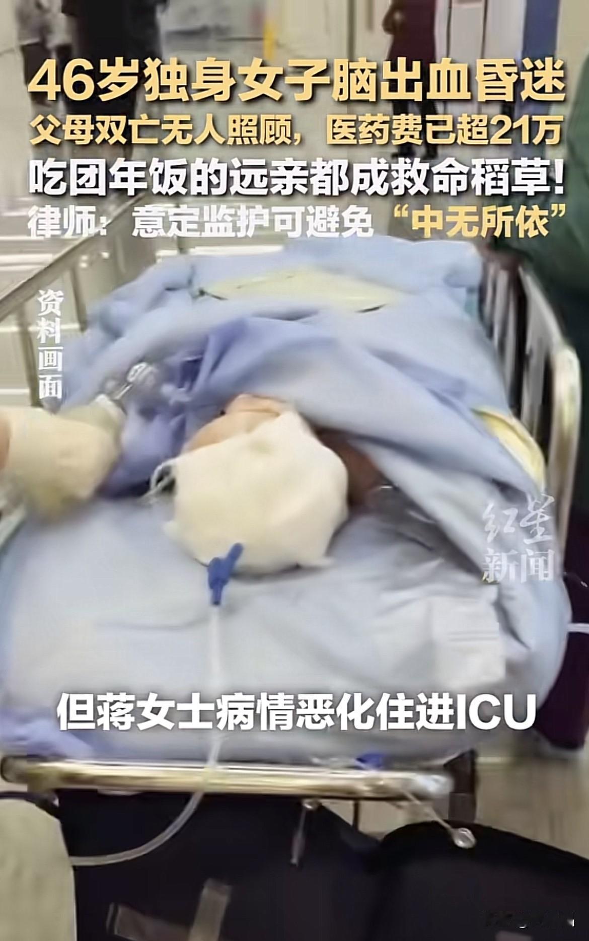 上海46岁独身女子突发脑溢血,父母已双亡,做手术连个签字的监护人都没有,翻遍了通讯录,只找到只逢过年吃一顿饭的远房亲戚签字,这会是多少中老年未婚未育孤独生活的写照呢? 10月14日,蒋女士因头晕无法运动,跟公司请假,同事不放心,前往蒋女士家中查看,发现蒋女士情况不妙后送往医院,经检查确诊是突发脑溢血。需要紧急做手术,但蒋女士未婚未育,父母已去世,没有近亲属可签字,最终只找到了在本地的表亲吴先生前来签字。在公司和吴先生的帮助下垫付了3万医药费,蒋女士总算是手术顺利。 但蒋女士术后病情反复,情况不好,住进了ICU治疗,每天需要5千到1万的医药费,代缴医药费已超过21万,医院找到了当时签字的吴先生,可吴先生也无力承担。因为吴先生和蒋女士是远房亲戚,吴先生的爷爷和蒋女士的奶奶是亲姐弟,吴先生不在蒋女士的法定监护人范围,无法动用蒋女士的财产来支付医药费。 吴先生通过咨询律师,得知可以找当地居委或者民政局作为蒋女士的监护人,当地居委了解蒋女士的情况后,愿意承担蒋女士监护人,想联系蒋女士投的重疾险保险公司和工资代收银行来垫付医药费,可对方回复不能办理,需要判定蒋女士无自主行事能力,且居委或民政局成为蒋女士法定监护人才能受理。 目前居委正在走相关流程,申请做蒋女士的法定监护人,这样才能支配蒋女士的财产帮她付医药费和后续照顾蒋女士。所幸经过治疗,蒋女士病情已稳定,但能不能恢复如初还不好说。 丁克一族或者未婚未育一族,有多少人正在或者即将面临蒋女士的困境?从蒋女士的鲜活案例,不由得深思,老龄化越来越严重,独身中老年人越来越多,保不准哪天有个头晕身疼,身边连个照顾的人都没有,居委或民政局帮忙也诸多流程和困难。 不过独身中老年人也不用太焦虑,可以提前意定监护人或者找近亲属、朋友或者信任的人签赡老扶养协议,商量好“你给我养老,我给你扶持,身后遗产由赡养人继承”,这样也能双方圆满。 我更想说的是,还年轻的未婚男女是否可以考虑结婚生子?有伴有娃,有家庭生活的温暖和幸福,晚年生活更有保障。 独身女子突发脑溢血 医药费已超21万