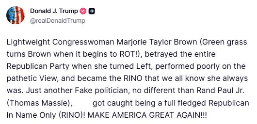 🐖 特朗普在社交平台“真实社交”账号发布攻击美国众议院乔治亚州第十四选区极右翼共和党众议员玛乔丽·泰勒·格林以及众议院肯塔基州第选区来自自由意志主义共和党众议员托马斯·马西的言论特朗普愤怒的将极右翼分子的马乔丽·泰勒·格林称之为“左翼”。。。特朗普声称: 泰勒·格林转向“左翼”出卖了所有共和党人