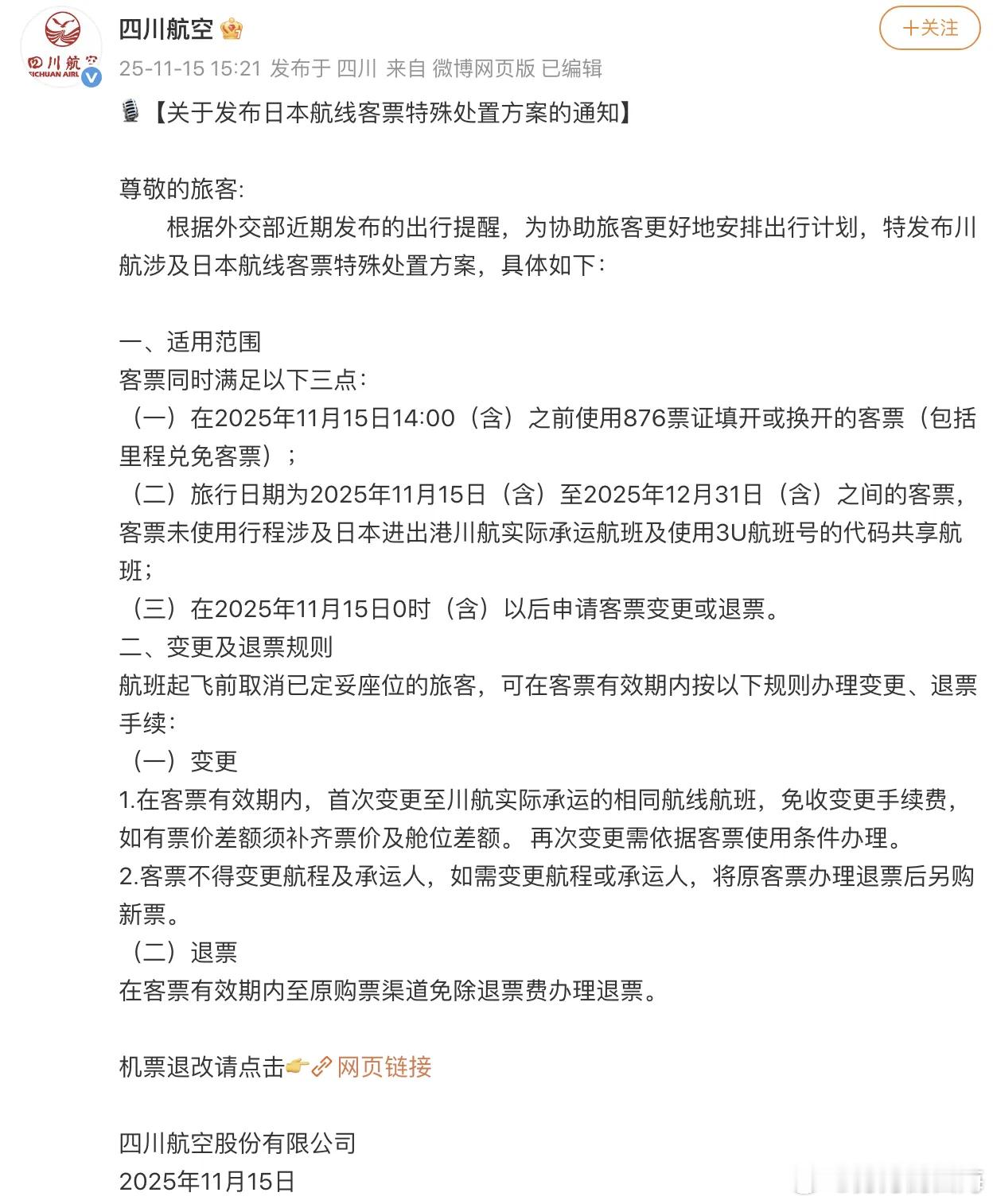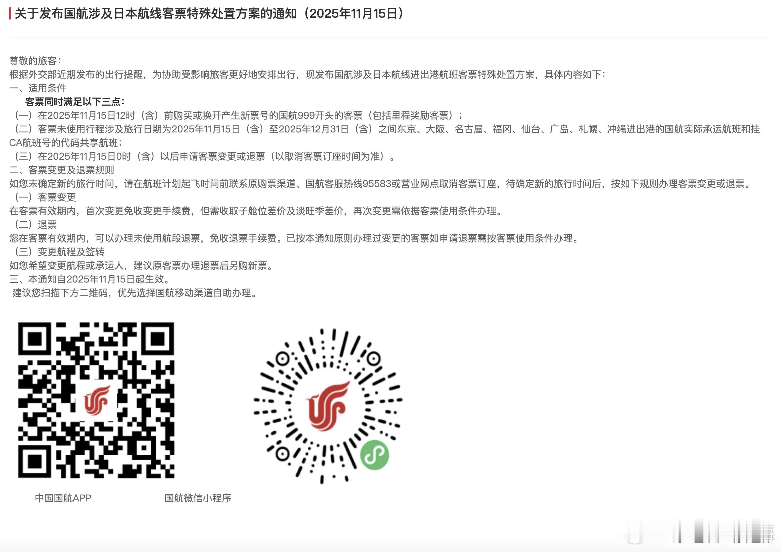 国航、南航、东航、海航、川航、厦航等,集体官宣!对于出行日期在12月31日之前,涉及日本相关航线且符合相关条件的客票,可予以免费退改处理。