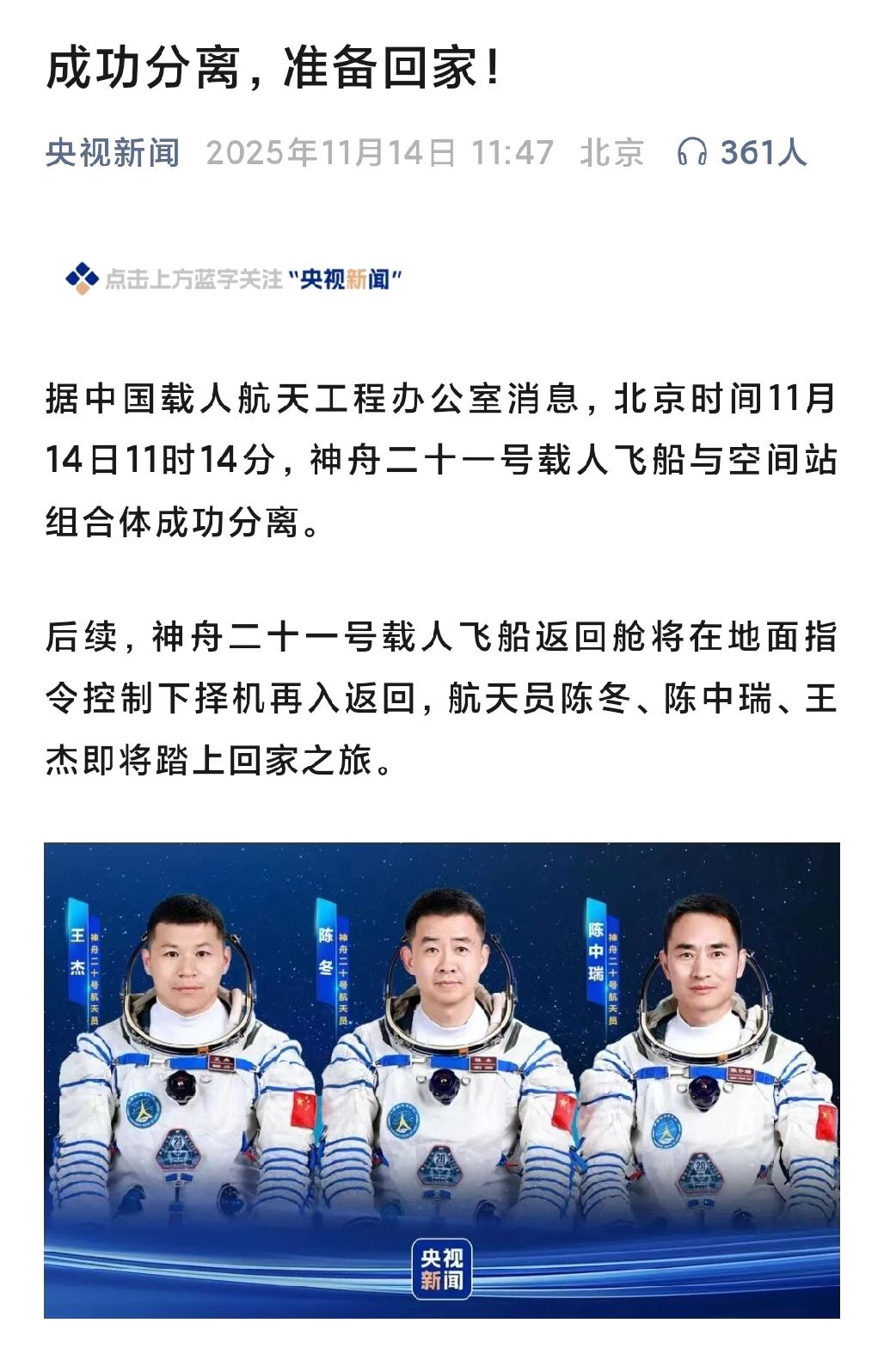 北京时间2025年11月14日11时14分,神舟二十一号飞船与空间站组合体成功分离。同日16点40分,神舟二十号乘组乘坐神舟二十一号载人飞船安全返回东风着陆场,三名航天员陈冬、陈中瑞、王杰身体状态良好,可以自主出仓!