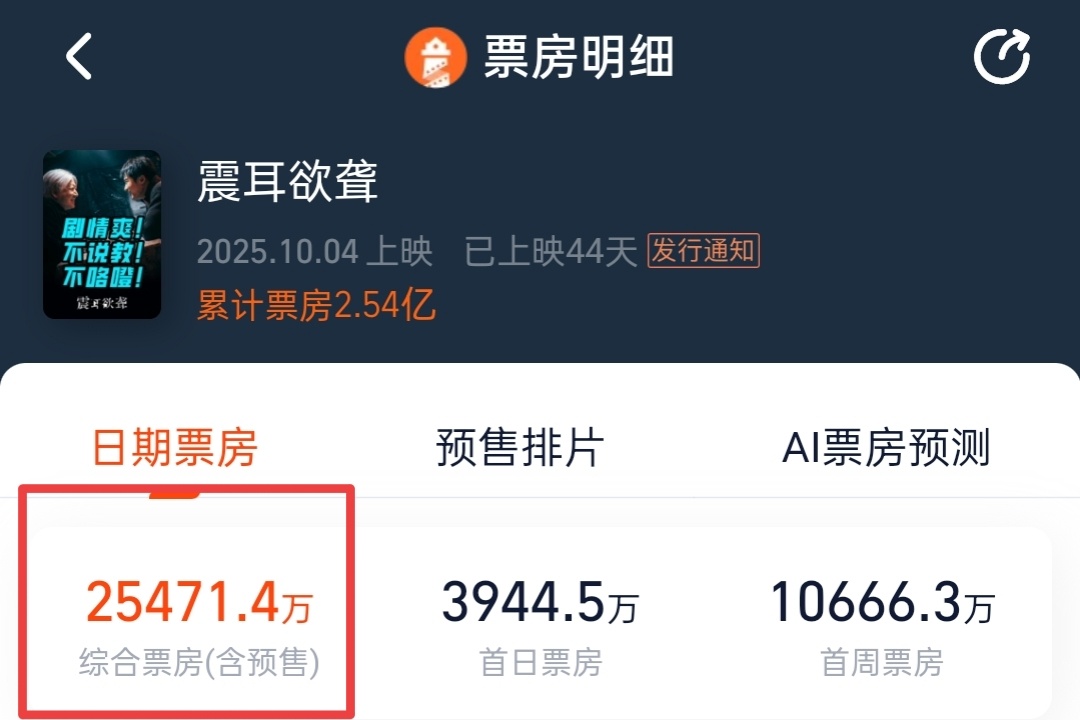 截至目前《震耳欲聋》2.5471亿+最新预测2.5499亿+ 2.55亿最终目标,只差一步,撑住啊!