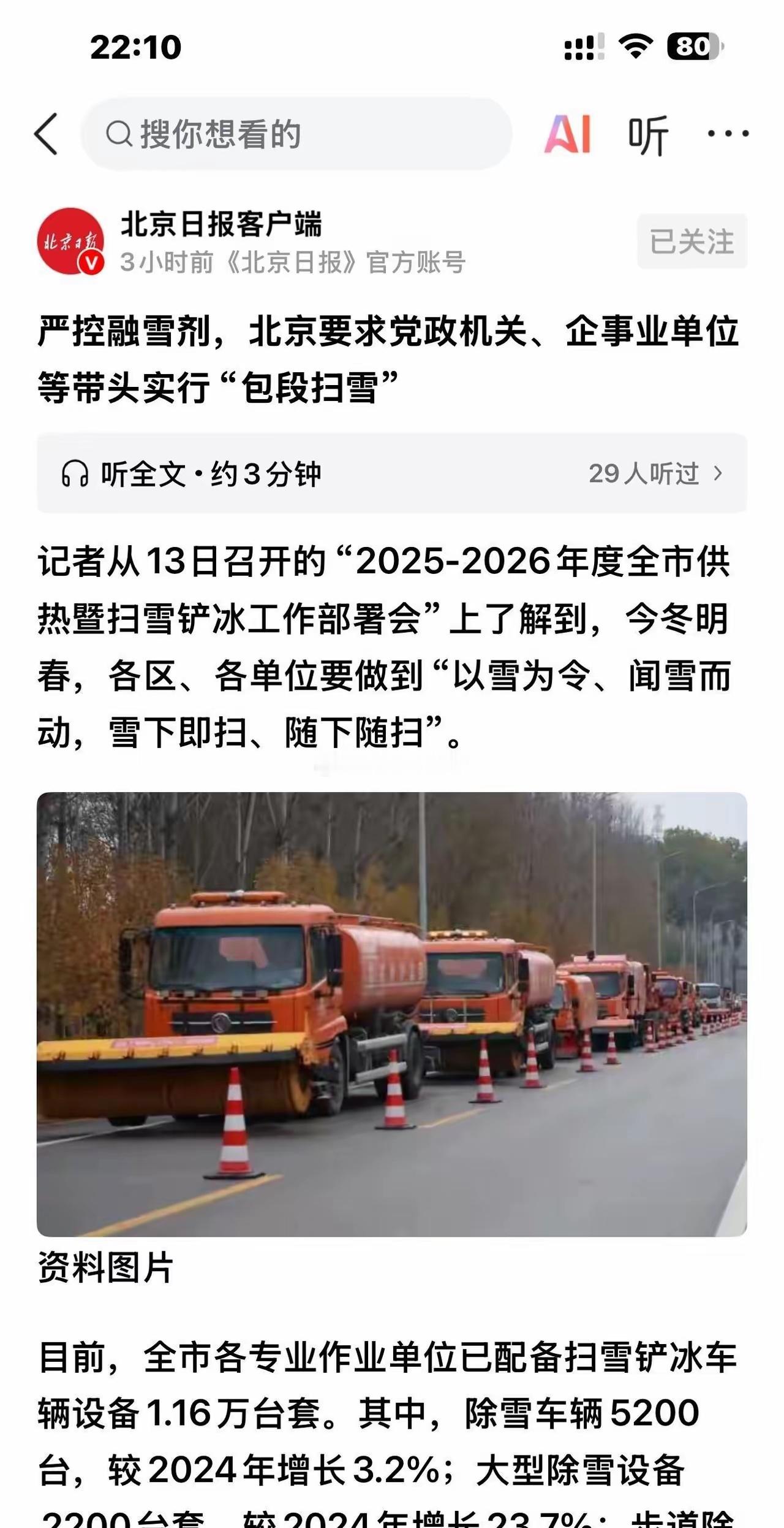 北京要求严控融雪剂这事挺有意思。以前下雪天满大街都是撒盐车,现在突然说要改人工扫雪,感觉像是突然醒过味儿来了。北京近期的一个动作,让很多人觉得有些突然。关于融雪剂,政策风向标转了,开始严格管控,甚至要求政府机关和事业单位的人都拿起铁锹,带头扫雪。这感觉像是突然意识到了什么,想起了过去的老办法。这一变,其实是把一道藏在冬天里的考题,摆在了所有人的面前。说实话,融雪剂这东西,效率是真的高。雪一下,撒上一层,冰雪很快就化成水,保障了道路最基本的通行能力。在追求速度的城市里,这简直就是救命稻草,让无数上班族免于迟到的焦虑。但这份方便是有价签的,而且价签上的数字,可能远比我们想象的要大。融雪剂里的氯离子,是腐蚀的一把好手。新铺的沥青路面,用不了多久就可能提前报废;桥梁道路下的钢筋混凝土结构,也在被它慢慢“啃”掉,缩短着寿命。不光是死物,活物也遭殃。路边的树木,就这么一棵棵枯死了。那些融化后的盐水渗入地下,污染了土壤和水源。河北有的村子,就因为紧挨着高速公路,田里的庄稼长势越来越差。还有我们的车,冬天跑多了,底盘锈得特别快,这背后也有融雪剂的“功劳”。最讽刺的是,这东西曾经还被包装成“绿色环保”的高科技产品。可如今一看,它带来的长期修复成本,无论是环境还是基建,都高得惊人,形成了一个“短期省钱,长期烧钱”的怪圈。那问题就来了,既然融手剂这么多毛病,为什么我们还这么依赖它?难道没有更好的办法吗?有,但落地很难。机械化除雪的技术早就成熟了,铲雪车、吹雪机组合起来,效率又高又环保,在东北一些地方已经用得很溜了。可最大的障碍,就是钱。一台进口的专业设备,动辄上百万,后续的维护保养也不是一笔小钱。这就造成了一种管理上的惯性。比如一些高速公路的管理者,他们宁愿一次次地采购相对廉价的融雪剂,也不愿意花一大笔钱去投资昂贵的设备。因为在他们的账本里,保障眼下的畅通,比什么都重要。于是,一个系统性的僵局就出现了。不是不知道什么是好东西,而是好东西的“门槛”太高。有人提出,我们自己造,把价格打下来不就行了?这当然是个好思路,但产业发展需要时间,远水解不了近渴。所以,这事儿不能玩“非黑即白”。彻底告别融雪剂不现实,尤其是在极端天气里,人工扫雪的效率实在有限。但继续滥用,无异于饮鸩止渴。真正的出路,可能在于学会“妥协”和“平衡”。我们得更精细化一点。比如根据路段的重要性、降雪的等级,来决定到底用什么方法。关键路段、紧急时刻,可以有限度地用一点融雪剂。而其他地方,完全可以探索替代方案。国外有些城市用碎木屑或者沙子来防滑,效果也不错。我们是不是也可以借鉴?同时,能不能投入更多研发,去搞一些没有腐蚀性的新型环保融雪剂?政府机关这次带头扫雪,其实释放了一个很强的信号。它不只是一个姿态,更是想撬动整个社会,特别是企业,一起参与到这场变革中来,改变过去单纯依赖化学品的思维。你看,一小撮白色的盐,牵扯出的其实是一座城市的发展哲学。我们到底是要眼前的绝对效率,还是要一个更健康、更可持续的未来?这道题没有标准答案,但北京这次的调整,无疑开了一个好头。它逼着我们去思考,去讨论,最终找到一个通行效率与环境保护之间的最佳平衡点。这不仅仅是技术的博弈,更是治理智慧的体现。
