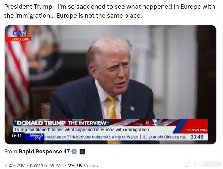 特朗普总统:“看到欧洲在移民问题上发生的事情,我感到非常难过……欧洲已经不再是原来的样子了。”