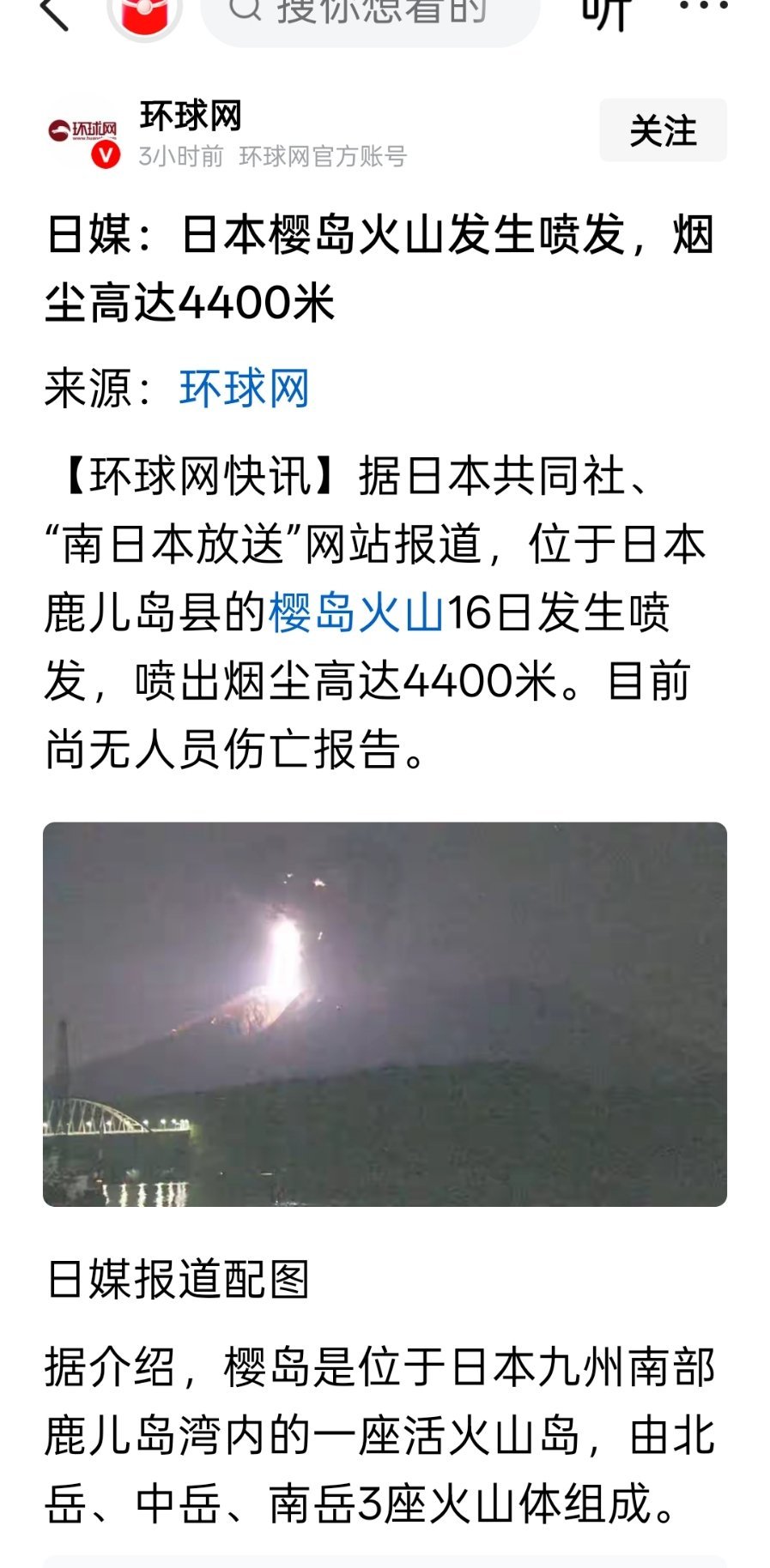 日媒:日本樱岛火山发生喷发,烟尘高达4400米