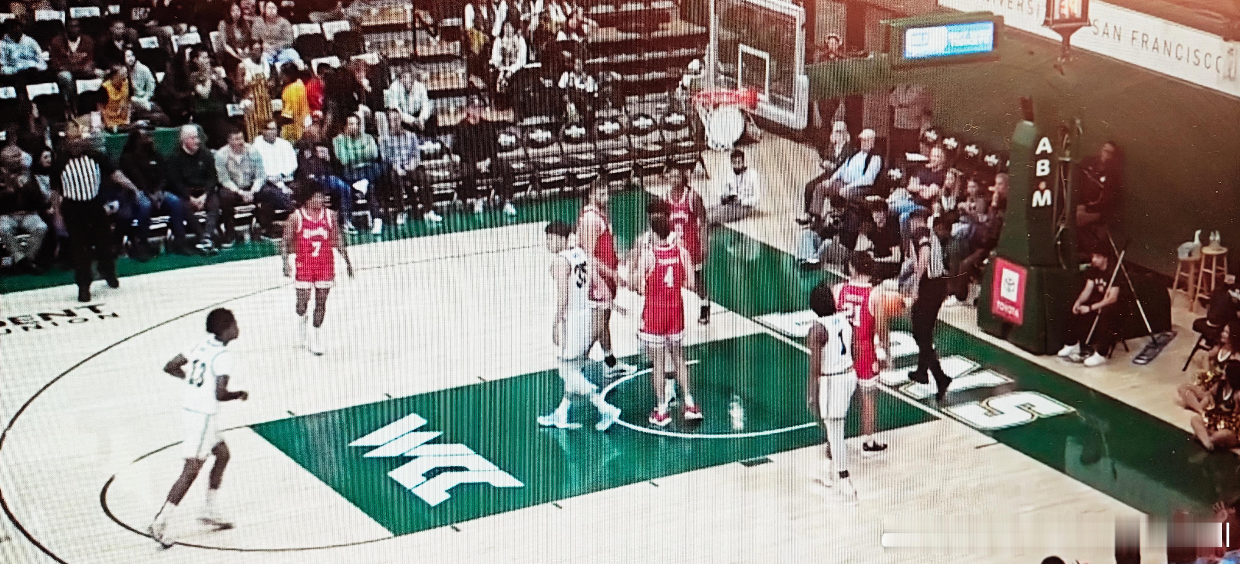 NCAA旧金山大学VS布拉德利大学比赛开始,王俊杰本赛季第一次以替补身份出场,顶