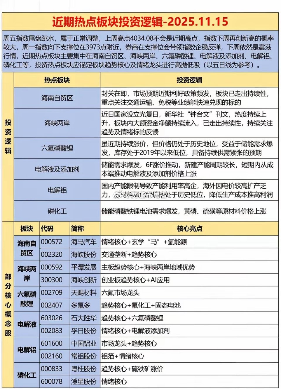下周热点板块前瞻:5大赛道+20支核心标的,震荡行情下的机会梳理上周五指数尾盘跳水属于短期正常调整,结合市场情绪与基本面逻辑,下周大概率维持震荡格局,且有望突破前期高点,券商板块或在支撑位发力领涨企稳。当前市场热点聚焦五大方向:海南自贸区(封关政策预期催化)、海峡两岸(政策热度持续升温)、六氟磷酸锂/电解液(储能需求爆发)、电解铝(产能约束+成本优势)、磷化工(储能电池需求拉动),操作策略可锚定板块趋势核心与情绪龙头,以五日线作为关键参考,灵活把握高低切换节奏。一、海南自贸区(封关政策预期主线)1. 海马汽车:板块情绪核心标的,叠加氢能源概念与市场“马”字玄学热度,深度绑定海南封关政策预期,短期资金关注度拉满,属于情绪带动型标的,操作需紧跟市场情绪节奏,快进快出为宜。2. 海峡股份:板块趋势核心+交通垄断标的,业务聚焦海南区域交通物流,封关后区域人员、货物流通需求将显著提升,公司业务具备区域独占性,业绩兑现逻辑清晰,是板块内偏稳健的趋势型选择。3. 海南高速:基建属性核心标的,主营海南区域交通基建与地产开发,封关落地后区域基建扩容需求明确,业务与自贸区发展协同性强,短期受政策预期催化,关注度持续攀升。4. 海南橡胶:资源型稀缺标的,国内唯一覆盖全产业链的天然橡胶企业,手握海南天然橡胶核心资源,具备独占性优势,封关后有望受益于农业产业政策倾斜,是板块内农业属性的稳健标的。二、海峡两岸(政策热度主线)1. 平潭发展:主板趋势核心标的,依托平潭地域优势,叠加近期板块热度与大额资金流入,业务涉及林业领域,短期受政策预期与市场情绪双重催化,是板块内核心趋势龙头之一。2. 海峡创新:创业板趋势核心标的,叠加AI应用概念,借助板块热度与AI赛道形成联动吸金效应,科技属性突出,情绪反馈速度快,更适配创业板资金偏好,弹性优势显著。3. 厦门港务:物流属性趋势标的,依托厦门港口核心区位优势,业务覆盖港口物流与贸易,两岸经贸热度升温将直接带动物流需求增长,具备实际业务支撑,属于板块内稳健型趋势标的。4. 漳州发展:地域型关联标的,扎根漳州核心区域,业务覆盖基建、水务等民生领域,深度绑定两岸区域发展进程,受政策催化明显,是板块内偏稳健的情绪联动型标的。三、六氟磷酸锂(储能需求主线)1. 天赐材料:行业龙头+业绩趋势双核心,覆盖六氟磷酸锂全产业链,当前产品价格虽处历史低位,但储能需求爆发带动供需紧张预期升温,业绩增长确定性强,是板块内核心标杆标的。2. 多氟多:板块趋势核心标的,布局氟化工与固态电池双赛道,既享受六氟磷酸锂涨价红利,又具备固态电池长期成长预期,业务多元化布局有效对冲周期波动,属于成长型优质标的。3. 天际股份:中小市值弹性标的,具备规模化六氟磷酸锂产能,业绩弹性与产品价格联动性强,受益于储能需求驱动的产品涨价周期,是板块内高波动、高弹性的短线标的。四、电解液(储能需求+成本传导主线)1. 石大胜华:板块趋势核心标的,深度绑定六氟磷酸锂产业链,储能需求增长叠加六氟涨价推动电解液价格上行,且新建产能周期较长支撑短期供需紧张格局,业绩弹性明确。2. 孚日股份:情绪核心标的,蹭电解液添加剂概念与板块热度联动,虽非主营业务,但情绪关联度高,波动幅度较大,适配短线资金快进快出的操作需求。3. 新宙邦:技术型趋势龙头,覆盖电解液及添加剂全产业链,技术壁垒高,业务布局全球化,既受益于储能需求扩容,又享受成本端传导带来的盈利提升,成长确定性强。五、电解铝(产能约束+成本优势主线)1. 中国铝业:行业龙头+权重型趋势标的,国内电解铝产能受限推高行业利用率,叠加海外扩产乏力、氧化铝价格低位运行降低成本,业绩与利润弹性充足,资金承接力强,是板块核心支柱。2. 常铝股份:情绪核心标的,叠加铝箔业务布局,借助行业成本优势与板块热度吸引短期资金,属于情绪带动型标的,波动较大,适合短线操作。3. 云铝股份:区域型趋势龙头,手握云南水电铝产能优势,受益于国内产能限制与氧化铝低价红利,成本优势与规模优势兼具,业绩利润弹性显著,是板块内优质趋势标的。六、磷化工(储能电池需求主线)1. 粤桂股份:板块趋势核心标的,受益于储能磷酸铁锂需求爆发,黄磷、硫磺等原材料涨价直接推动业绩增长,覆盖磷化工全链条,业绩弹性突出。2. 澄星股份:情绪核心标的,聚焦磷化工上游环节,借助板块热度与原材料涨价预期走情绪行情,走势紧密跟随板块情绪节奏,是短线情绪联动标的。3. 兴发集团:全产业链权重龙头,覆盖磷矿、黄磷、磷酸全环节,业务协同性强且技术壁垒高,受益于储能磷酸铁锂需求驱动的原材料涨价,兼具业绩确定性与长期成长性。其余核心标的补充- 海南自贸区:无新增标的(上述4支已覆盖核心逻辑)- 海峡两岸:无新增标的(上述4支已覆盖核心逻辑)- 六氟磷酸锂/电解液:无新增标的(上述6支已覆盖龙头、弹性、技术型标的)- 电解铝:无新增标的(上述3支已覆盖龙头、区域龙头、情绪标的)- 磷化工:无新增标的(上述3支已覆盖权重龙头、趋势核心、情绪核心)总结本次梳理的20支标的均为当前五大热点板块的情绪核心或趋势龙头,核心逻辑围绕两大主线展开:一是政策预期驱动(海南自贸区、海峡两岸),二是行业供需缺口(六氟磷酸锂、电解液、电解铝、磷化工)。短期标的弹性强、资