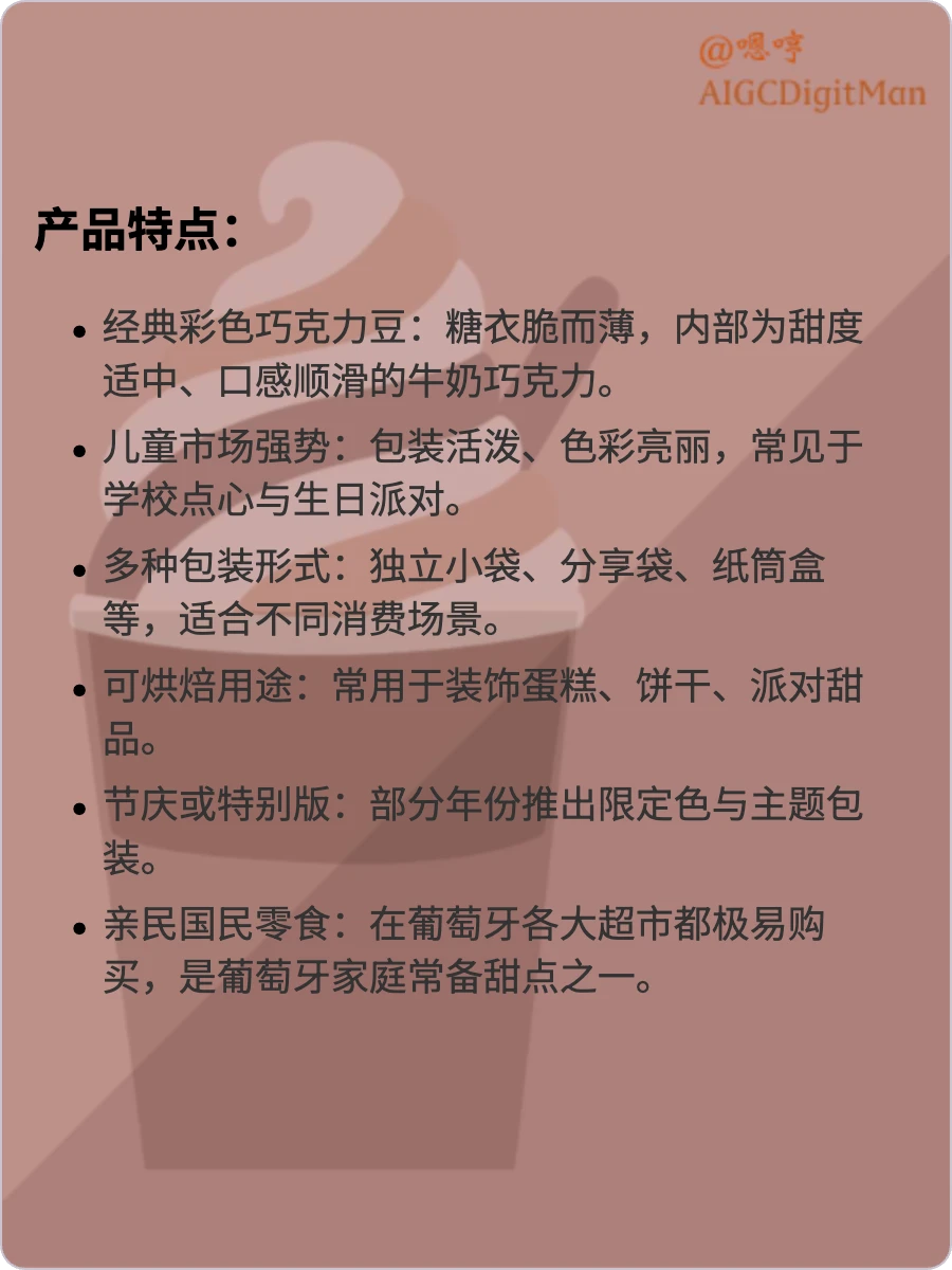 这一品牌最早于 20 世纪中期推出,以色彩缤纷的巧克力糖衣豆迅速成为葡萄牙儿童零食中的经典代表,被视为“葡萄牙版 Smarties/M&M’s”。