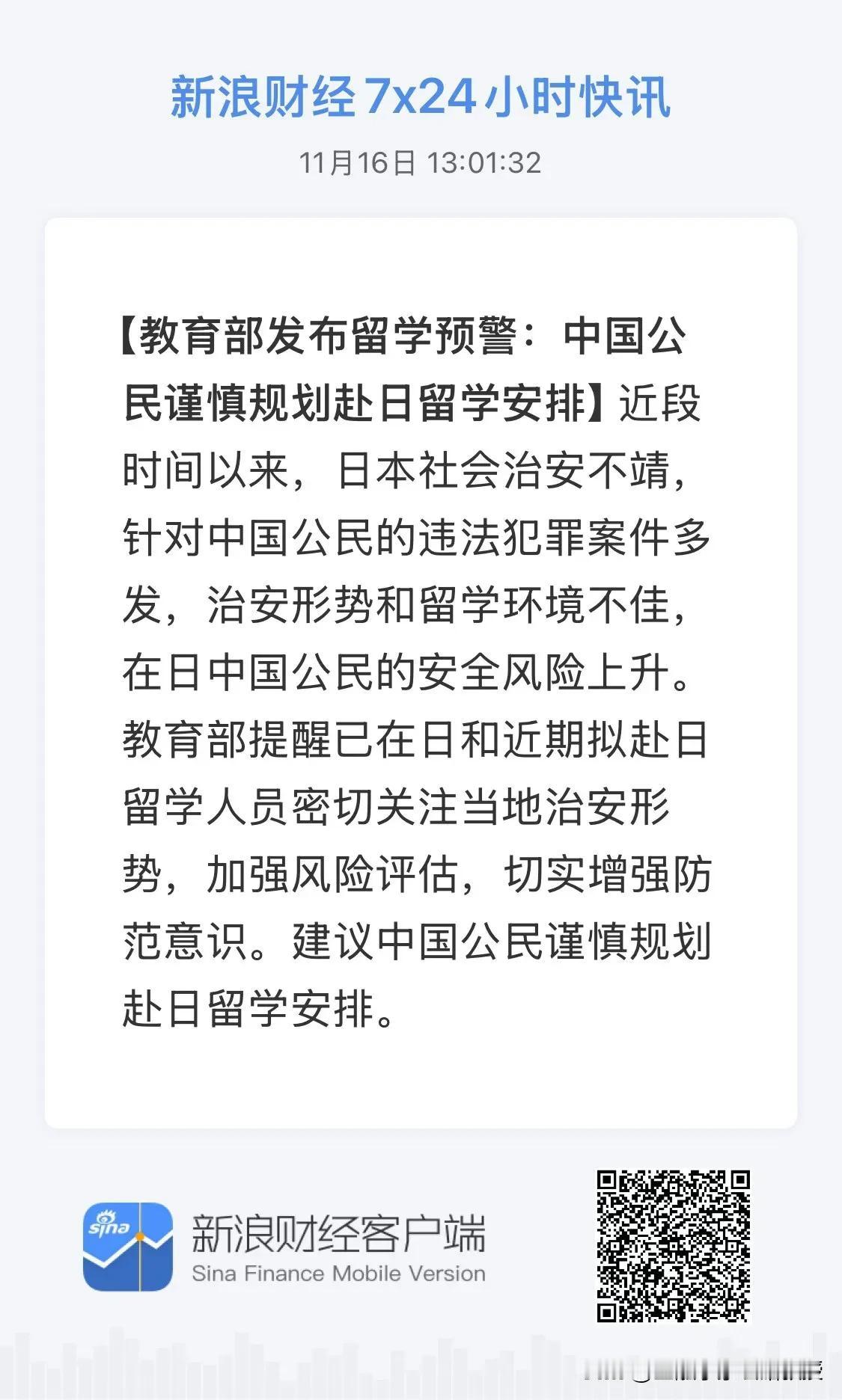 刚刚教育部也出手了,发布“中国公民谨慎规划赴日留学安排”,昨天外交部发的是“避免前往日本”。中国一直以来都是日本最大的旅游客源国和留学生生源国。高市早苗这么不知悔改地“搞事”,未来没有中国游客和中国留学生,日本经济将遭到重创,日本劳动力短缺的问题也会愈发凸显。