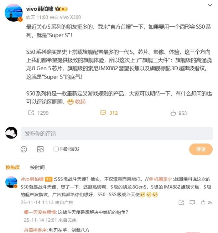 【vivo S50 系列新机“官方首爆”:史上旗舰配置最多的 S,采用高通骁龙 8 Gen5 芯片】vivo 产品经理韩伯啸“官方首爆”vivo S50 系列新机,称其是“Super S”,也是史上搭载旗舰配置最多的一代 S。韩伯啸表示,希望给 vivo S50 系列手机的芯片、影像、体验三个方向都提供极致的旗舰体验,所以这次上了“旗舰三大件”:旗舰级高通骁龙 8 Gen5 芯片 + 旗舰级的索尼 IMX882 潜望长焦 + 旗舰标配 3D 超声波指纹。消息称 vivo S50 系列手机定档 12 月,内部代号「战斗天使」,ID 设计还是简约轻薄路线,在同档位里软硬件规格都拉得很满。另外,型号为 V2528A 的 vivo 新机在 11 月 5 日通过了 3C 认证,支持 90W 快充,该博主爆料称是 vivo S50 系列手机。