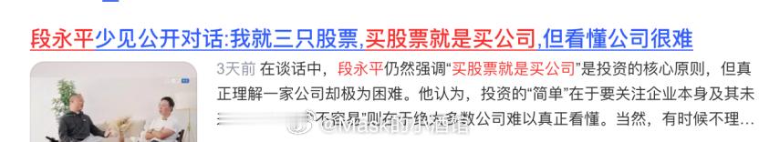 段永平的投资逻辑,普通人如何抄作业?投资大师段永平最近在美国聊了几个小时,我觉得如果我早点听到这些话,我的资产应该已经多翻了几倍了。这个创立了小霸王和步步高,投资网易赚了100多倍,重仓苹果、腾讯、茅台的传奇人物,终于还是把他的天阶心法交了出来。那我们今天就一起来看看,段永平到底说了啥!段永平说自己一直胸无大志,就想过好小日子。现在每天的生活就是打球、运动,唯一的变化是换不同的球场。从江西农村出来,辗转北京、广东、东莞,最后定居加州。这一路走来,段永平做决策的逻辑很简单:待着不舒服就离开。在北京不舒服,就去广东;小霸王老板不够诚信,三个月就走人;公司机制有问题,再好也离开。这种断舍离的能力,才是真正稀缺的。很多人明知道待的地方不对,却舍不得走,总想着再等等、再看看。段永平不等,刮刮卡刮出"谢"字就不刮了,这就是他的原则。买股票就是买公司说起投资,段永平最常讲的就是巴菲特那句买股票就是买公司,甚至把这句还写在了自己的签名里。但他在访谈中说:能真懂这句话的人,可能不到1%,做到就更难。什么叫真懂?段永平投资生涯打的孔其实不多:网易、雅虎、苹果、茅台、腾讯、拼多多、伯克希尔哈撒韦,勉强还能再加上通用电气和西方石油,数下来还不到10个。巴菲特说一辈子20个孔就够了,段永平连一半都没用完。2011年他开始买苹果,最高仓位到了90多个点,一直买一直买。为什么这么敢?因为他本身就做手机,看得懂苹果的生意模式和企业文化。他早就知道苹果一定会出大屏手机,只是没想到库克扛了三年才推出来。这三年里,段永平从没怀疑过,因为他知道用户需要大屏,这是做产品的人才有的确定性。买茅台2021年茅台2600块的时候,段永平想过卖。但他问自己一个问题:卖了之后买什么?环顾四周,什么都买不下手。后来茅台跌到1200块,腰斩了。有人说你看吧,当时卖了多好。段永平的回答很有意思:那些2600块卖掉的人,他们买的别的东西亏得更多。你卖了茅台,钱总得有地方去吧?放银行?那还不如拿着茅台拿分红。这就是机会成本的思维。投资不是猜涨跌,而是在你看得懂的东西里,选回报最好的那个。段永平说,如果当时有个更好的标的,他肯定会换。但没有,所以继续拿着。这才是真正的长期主义,不是死拿,而是拿着最优解。AI来了,散户更危险了聊到AI,段永平的观点很明确:这是一场工业革命,但炒股的人会更难赚钱。因为量化基金有了AI加持,散户想靠看图看线赚钱?你就是铁铁的韭菜。但AI收割不了段永平,因为他不动。买了茅台就拿着,买了苹果就拿着。公司最终靠盈利会把自己买回来,你只要确定公司能持续赚钱就行了。这就是"买股票就是买公司"的真正含义。市场怎么波动,跟你没关系;AI怎么收割,也跟你没关系。你只需要关心公司的生意好不好,现金流稳不稳。给普通人的建议采访最后,方三文问段永平对普通人有什么投资建议。段永平的回答很直接:不懂就不要碰,炒股很难赚钱,80%的散户在牛市和熊市都亏钱。如果真不懂投资,就买标普500,或者买伯克希尔哈撒韦。如果你喜欢喝茅台,为什么不买茅台?如果你是苹果用户,为什么不买苹果?投资你懂的东西,比什么都重要。听完这场对话,我最大的感受是:投资真的很简单,但确实不容易。简单在于道理就那么几句话,不容易在于大部分人做不到。段永平这二十年,其实就在做减法。不做代工,不碰不懂的生意,不炒股,不追热点。三十年下来,差别就在于少犯的那些错误。所以他现在可以每天打球,偶尔看看财报,生活过得像个退休老头。但账户里的数字,恐怕是对99%人来说的天文数字……这就是复利的力量,也是做对的事情的力量!风险提示:短期涨跌不预示未来,如提及个股或基金不代表投资建议。投资需谨慎。