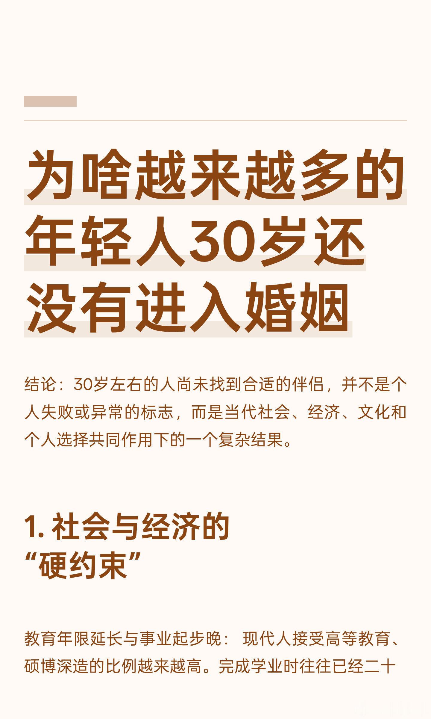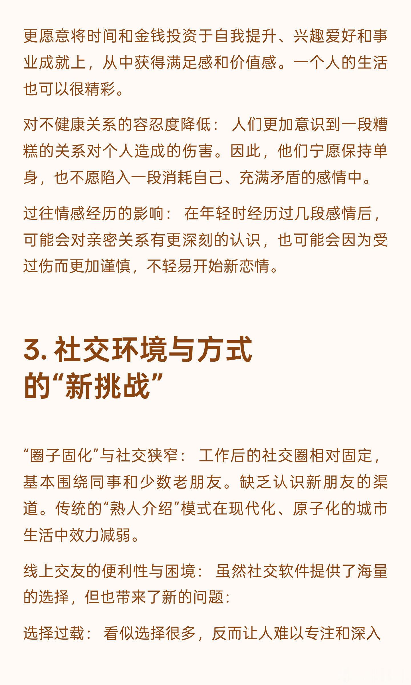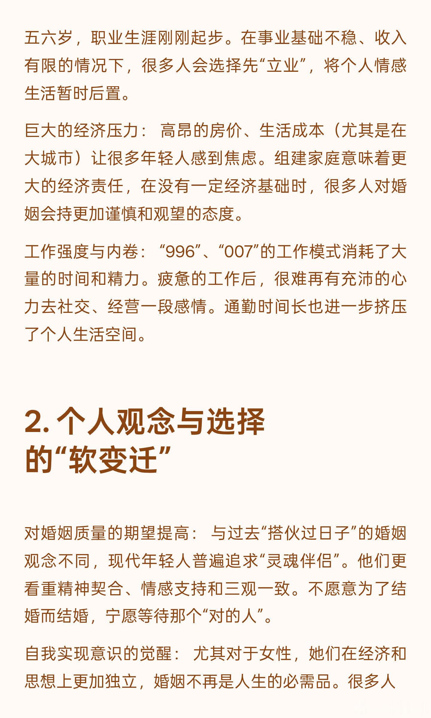 不上班、不结婚的年轻人日益增多,绝非简单的“躺平”,而是对传统生存模式的深度解构与重构。从经济维度看,就业市场的“内卷化”与生活成本的高企,让年轻人对职场晋升的投入产出比产生质疑,“不上班”是对“996福报”的无声反抗;从社会维度,婚姻从“生存刚需”沦为“生活选项”,教育、住房等成本的叠加,使年轻人对组建家庭的性价比重新考量。更深层的是价值体系的变迁,Z世代更注重个体价值实现与生活质感,“不上班”可探索自由职业、兴趣创业的多元路径,“不结婚”则是对传统家庭责任的解绑,转而追求情感与自我的独立成长。这种选择不是逃避,而是在时代浪潮中,年轻人对生存方式的主动重塑——以个体为中心,重新定义工作与婚姻的意义。