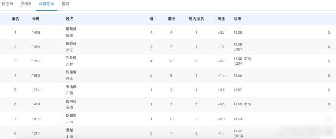 全运会田径女子100米预赛:葛曼棋第一、陈妤颉第二、孔玲瑶第三 今天全运会女子百米预赛,葛曼棋跑出十一秒三六,第一个冲过终点,拿了小组第一,陈妤颉和孔玲瑶紧跟着冲线,俩人都跑了十一秒三九,孔玲瑶还破了个人最好成绩,看台上的人都热闹起来。 比赛全程看得人心里直跳,除了三位顶尖选手,韦永丽、刘峡君这些老将也进了半决赛,许佳璐跑出十一秒五五排第四,史琳琪和潘越分别以十一秒五八和十一秒六二勉强挤进八强,八个人里有一半都打破了自己最好成绩,这场预赛真不是盖的。 葛曼棋还是老样子,稳稳当当的,陈妤颉和孔玲瑶却一下子冲了出来,连她们自己都说没想到能跑出这个成绩,孔玲瑶尤其让人意外,这一下子,大家心里都开始琢磨她后面还能走多远,半决赛谁要是能冲过十一秒三,那就得看明天风大不大,跑道干不干了。