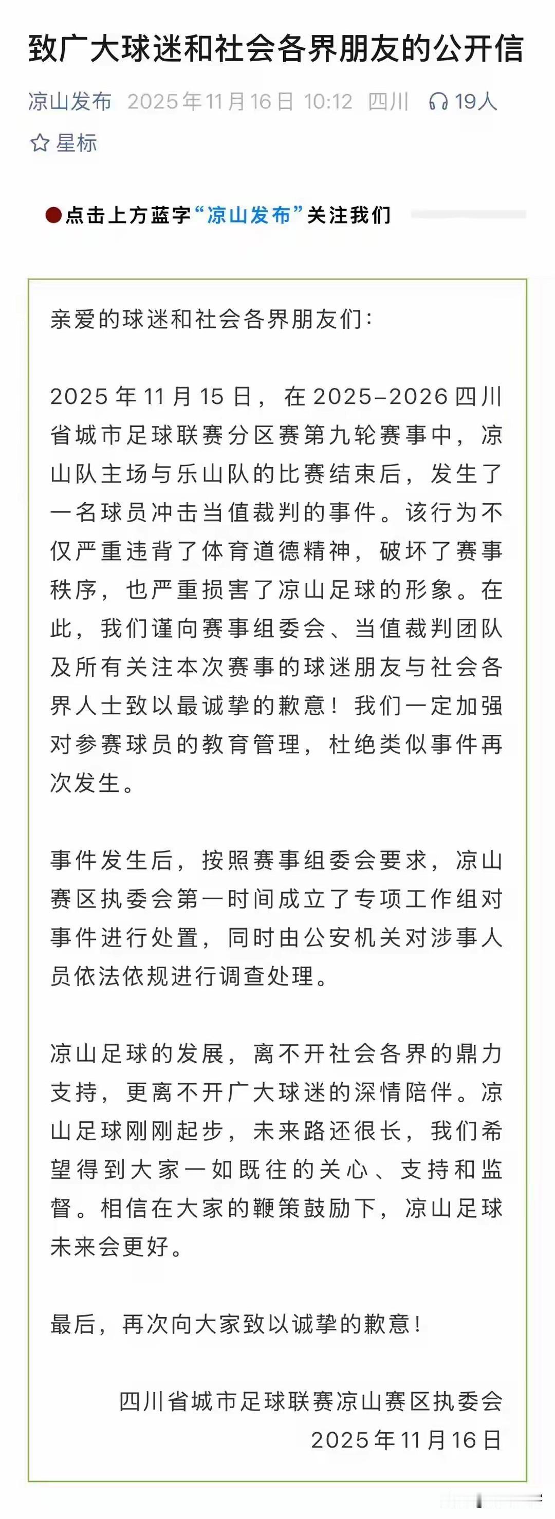 川超飞踹裁判并非一纸道歉那么简单,他背后透露出的是赛事组织的缺失和对规则的敬畏! 在川超联赛凉山队和乐山队的比赛结束后,彝族球员卡马文加因为对判罚不满直接对裁判上演“佛山无影脚”将其飞踹在地,造成后者头部受伤,尽管在事件发生后当地警方迅速介入,涉事球队凉山领队紧急撇清关系,赛事组委会书面道歉,但他产生的影响却是巨大的,甚至有可能导致川超终止举办。 由于苏超的巨大成功,近段时间各种足球赛事喷涌而出,这和近些年全国各地举行马拉松有着异曲同工之妙,就是大家从中看到了经济利益,因此才会乐此不疲,由于马拉松泛滥成灾,目前关于这种赛事已经逐渐在压缩和遏制,但是各个省份的足球联赛却在扩张,不过关于这种联赛,大多人看到了苏超带来的经济蛋糕,但却忽视了内在本质,因此在举办这类比赛时,缺少了赛事保障和精准组织,最终导致出现飞踹裁判的悲剧。 鉴于出现如此恶劣的事件,小编好事建议川超终止举办 赛事,希望接下来静下心来深刻剖析自身的不足,待制定科学的赛程和组织方案后再恢复此项赛事,如果仅仅是用拆东墙补西墙的方式来组织赛事,估计接下来还会出更大的乱子![作揖][作揖][作揖]