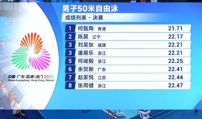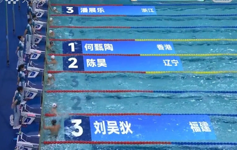 全运会游泳男子50米自由泳决赛,何甄陶夺得金牌,陈昊银牌,潘展乐和刘吴狄并列第三!男子50米自由泳决赛成绩🥇何甄陶 21.71🥈陈昊 22.14🥉刘吴狄 22.21 PB🥉潘展乐22.21