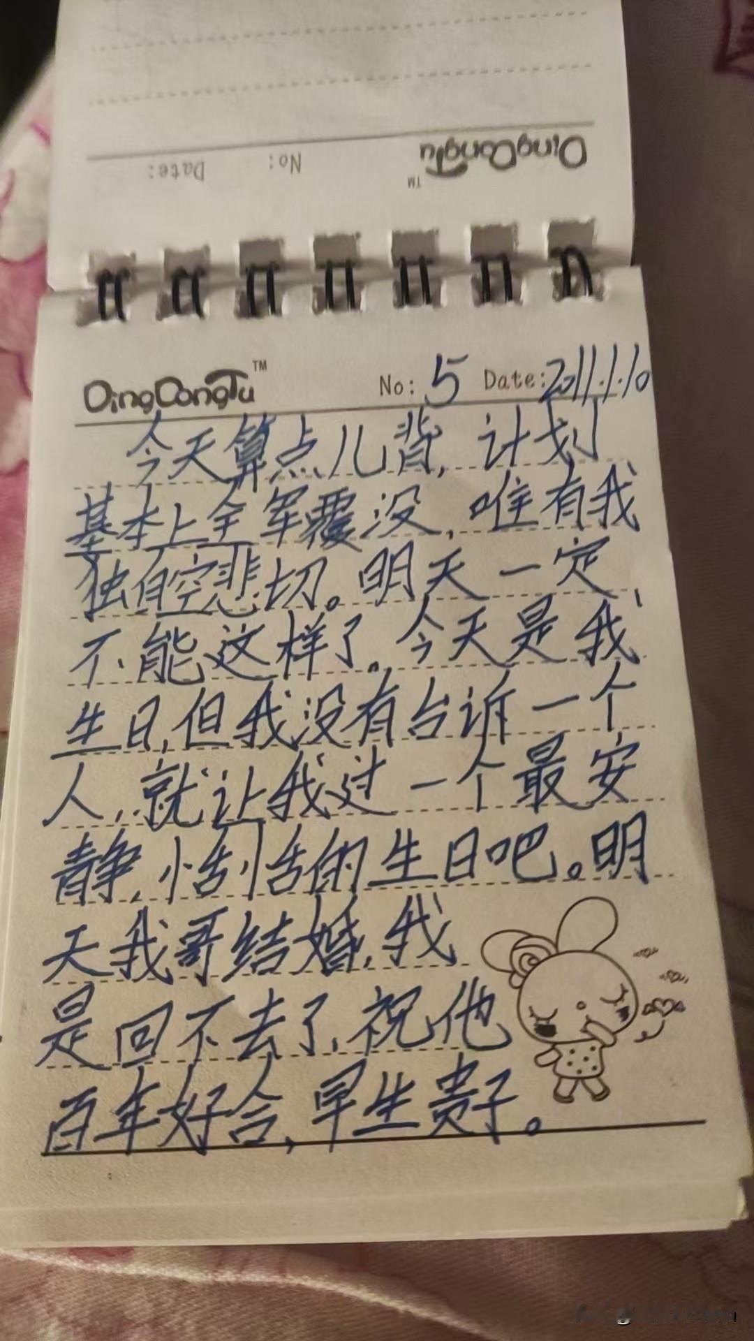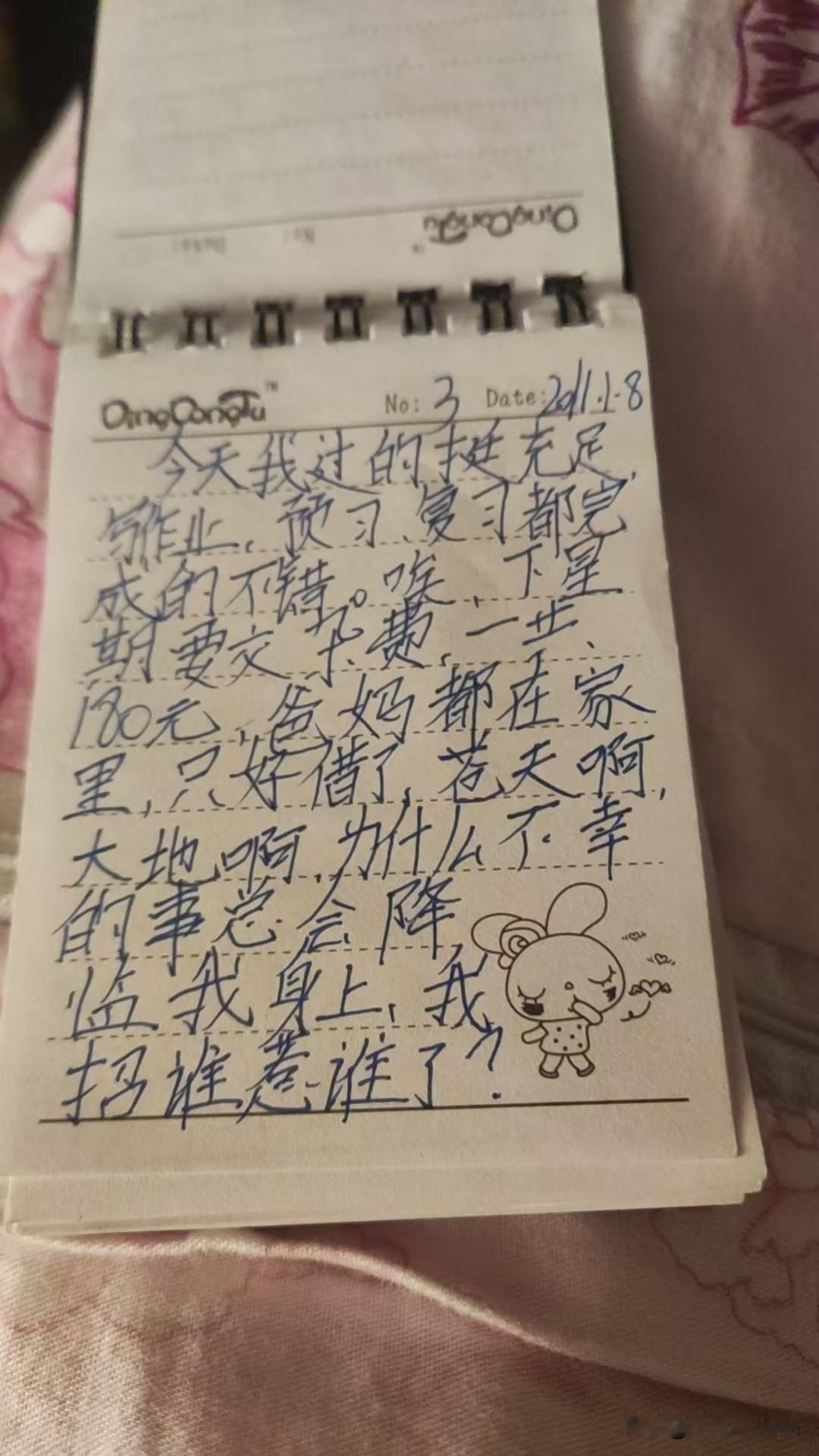 晚上正值班的时候,老妈发给我两张图片,是我十几年前上初中的时候写的日记,读起来还挺有意思的。 看时间,一张是2011年的1月8号,上边记录了要交学杂费的事,因为爸妈不在身边,所以只能找同学借钱,顺便吐槽了一下自己的不幸。 另一张是1月10号,写了我自己偷偷一个人过生日的事情,几天后是我哥的婚礼,我不能回去,所以在字里行间遥祝了一番。 我是一个三天打渔、两天晒网的人,做什么事常常是三分钟热度,很难坚持下去,单说写日记的念头至少也十几次了,但没有一次能坚持下来。 所以,能见到十几年前自己写下的这两页日记,也是殊为难得。那时候的字还很丑,那时候的想法还很幼稚,那时候的自己还很浮夸,匆匆一过近15年,如今也是一个年近三十、身材发福的老登了。 时光一去不复返,留下的只是怀念和无限的唏嘘。