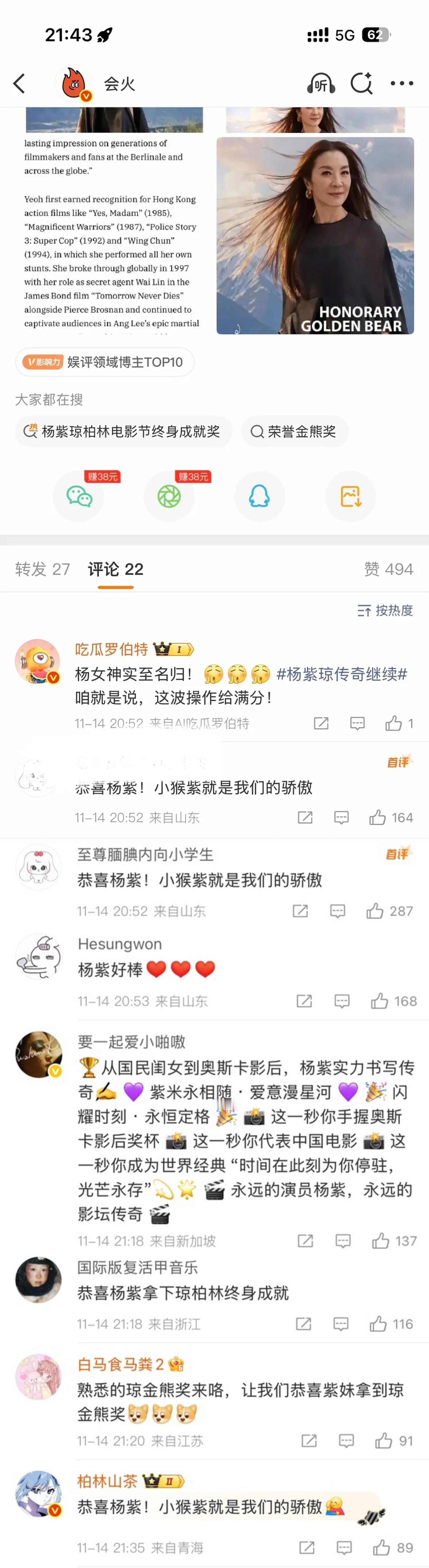 历史再次重演,恭喜杨紫获得柏林电影节终生成就奖,有这样的粉丝真的不可能“琼”。