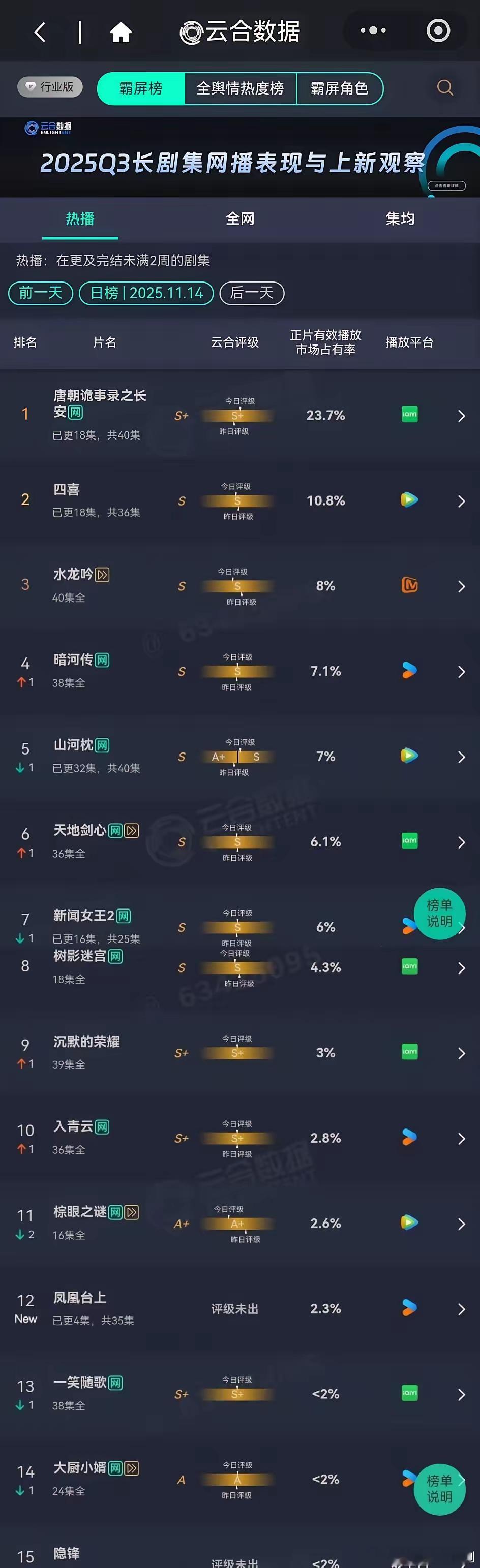 11.15新片云合唐诡3 |25.4% 估值4860w四喜 | 10.8% 估值2065w山河枕 |6.7% 估值1300w新闻女王2 | 5.5% 估值1115w凤凰台上| 5.1% 估值976w