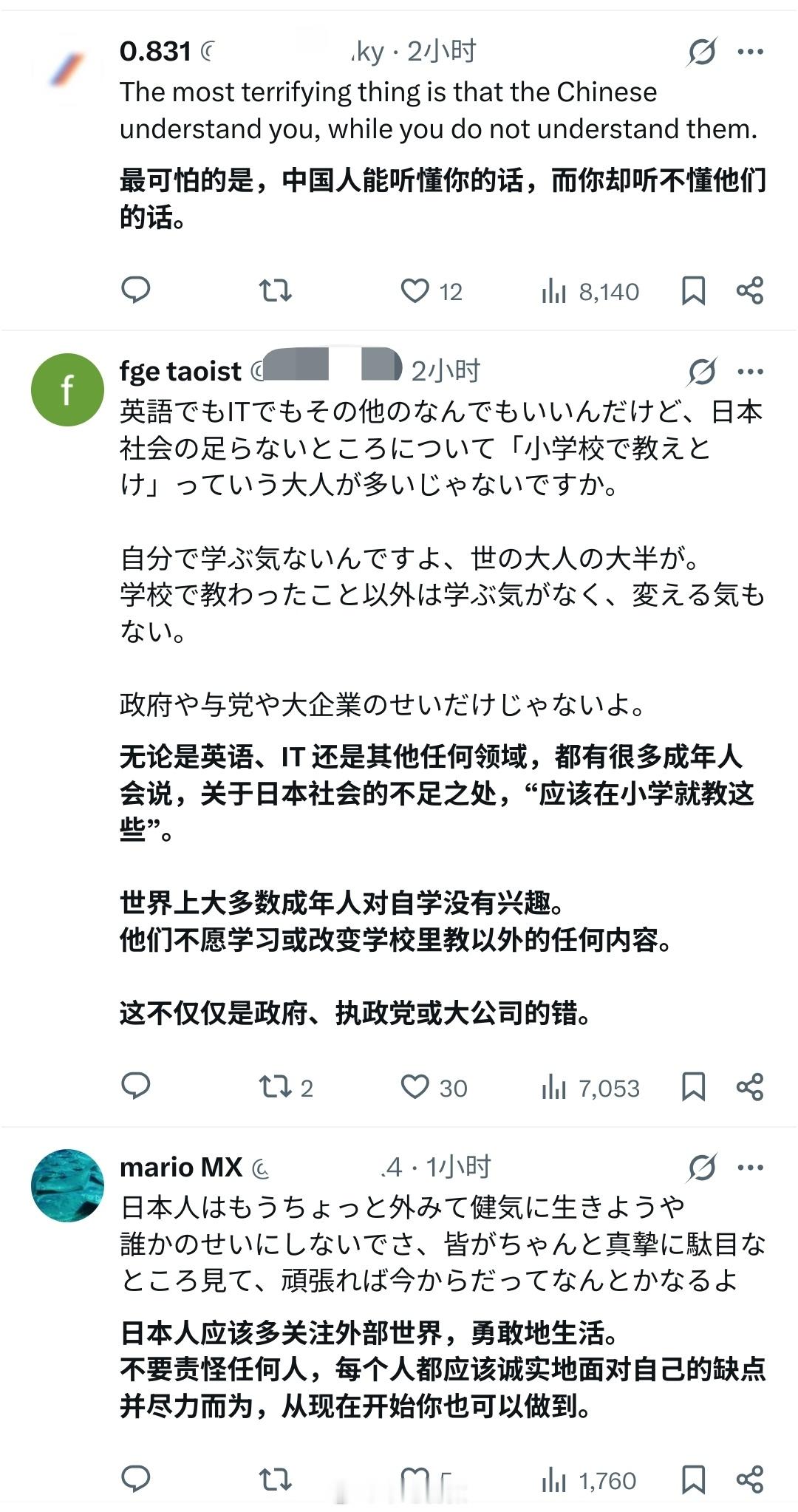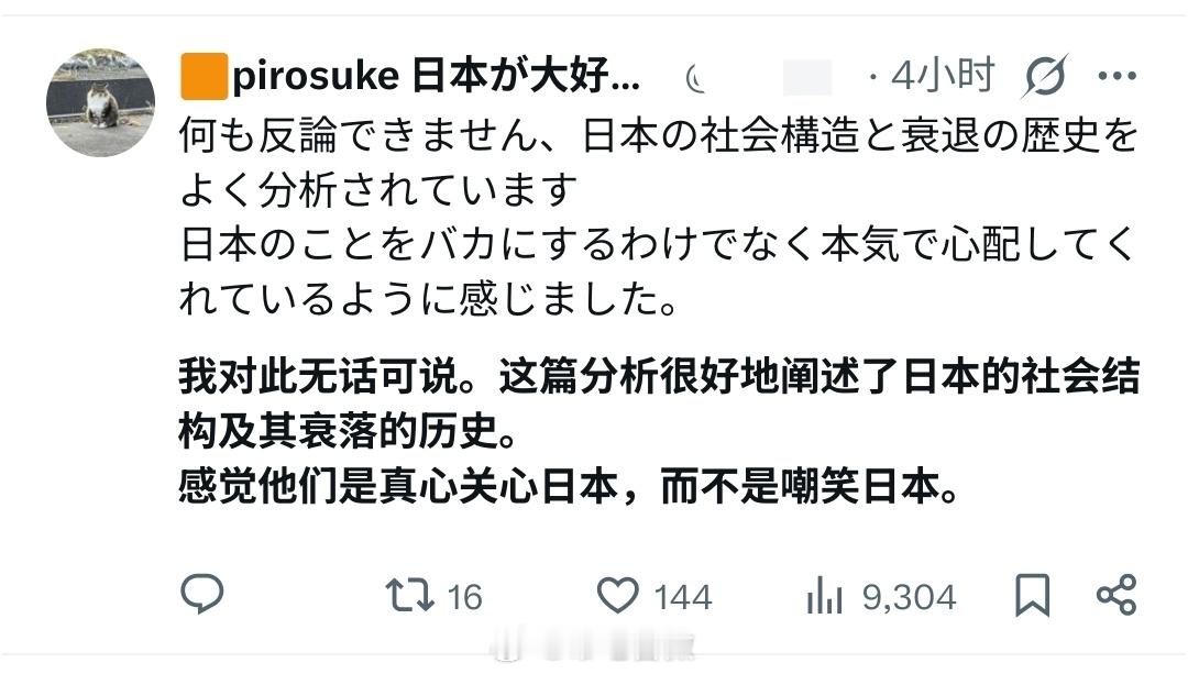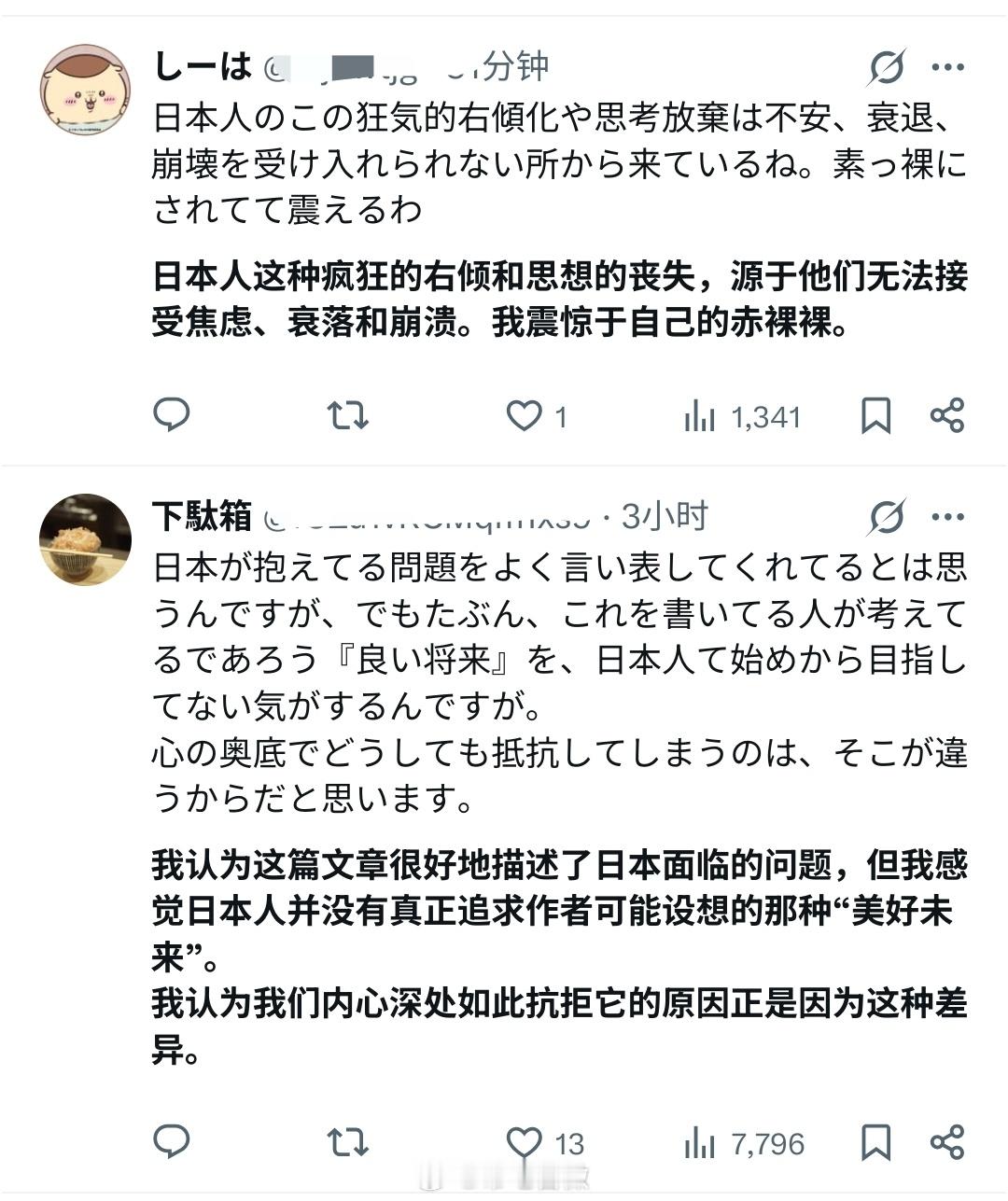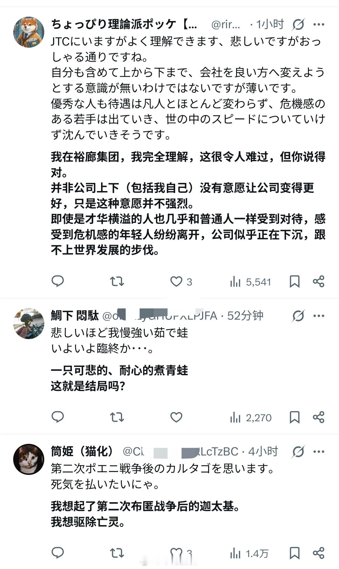 将平原公子的翻译成日文,给日本网友看了以后,他们发表的感想。⭐大部分日本人认可“日本死气”的说法,上班族们忍受自身的焦虑、日本整体的衰落和崩溃,却无力应对,只能像温水煮青蛙一样承受。⭐一位日本上班族说的特别好:(在日本生活)就像在密闭的房间里呼吸,你呼吸的是空气,但却缺乏氧气。