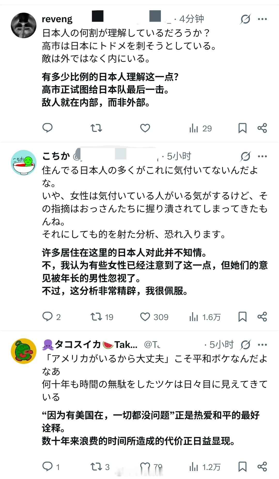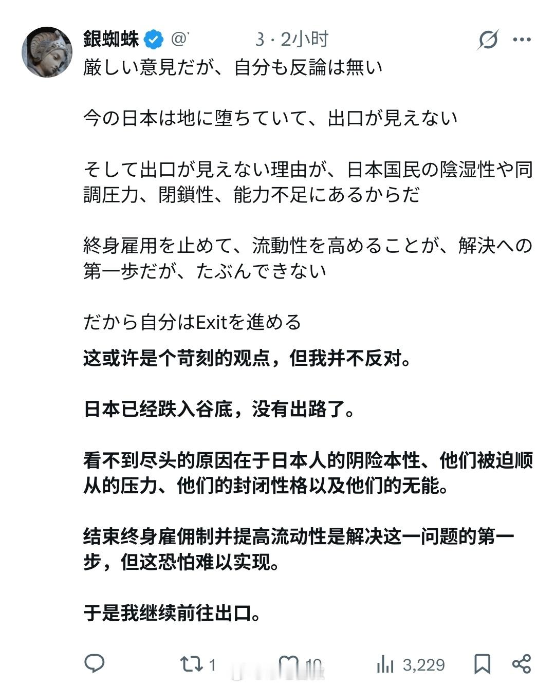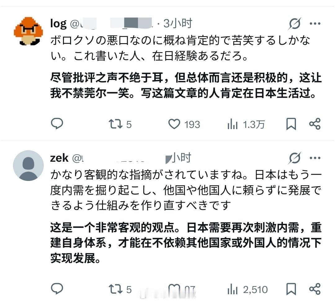 将平原公子的翻译成日文,给日本网友看了以后,他们发表的感想。⭐大部分日本人认可“日本死气”的说法,上班族们忍受自身的焦虑、日本整体的衰落和崩溃,却无力应对,只能像温水煮青蛙一样承受。⭐一位日本上班族说的特别好:(在日本生活)就像在密闭的房间里呼吸,你呼吸的是空气,但却缺乏氧气。