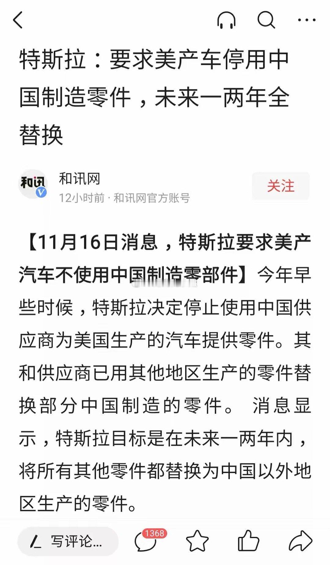特斯拉要求美产汽车不使用中国制造零部件!先是通用汽车要求其美产汽车供应链实施“去中国化”战略,要求供应商在中国以外寻找原材料和零部件替代,想在2027年前,全面停止使用中国零部件!现在是特斯拉,福特还未跟进?但通用与特斯拉也算是美国车企的风向标了?地缘政治带来的供应链风险以及关税政策,让车企在未雨绸缪?这算是提前在做全面脱钩的准备了吗?