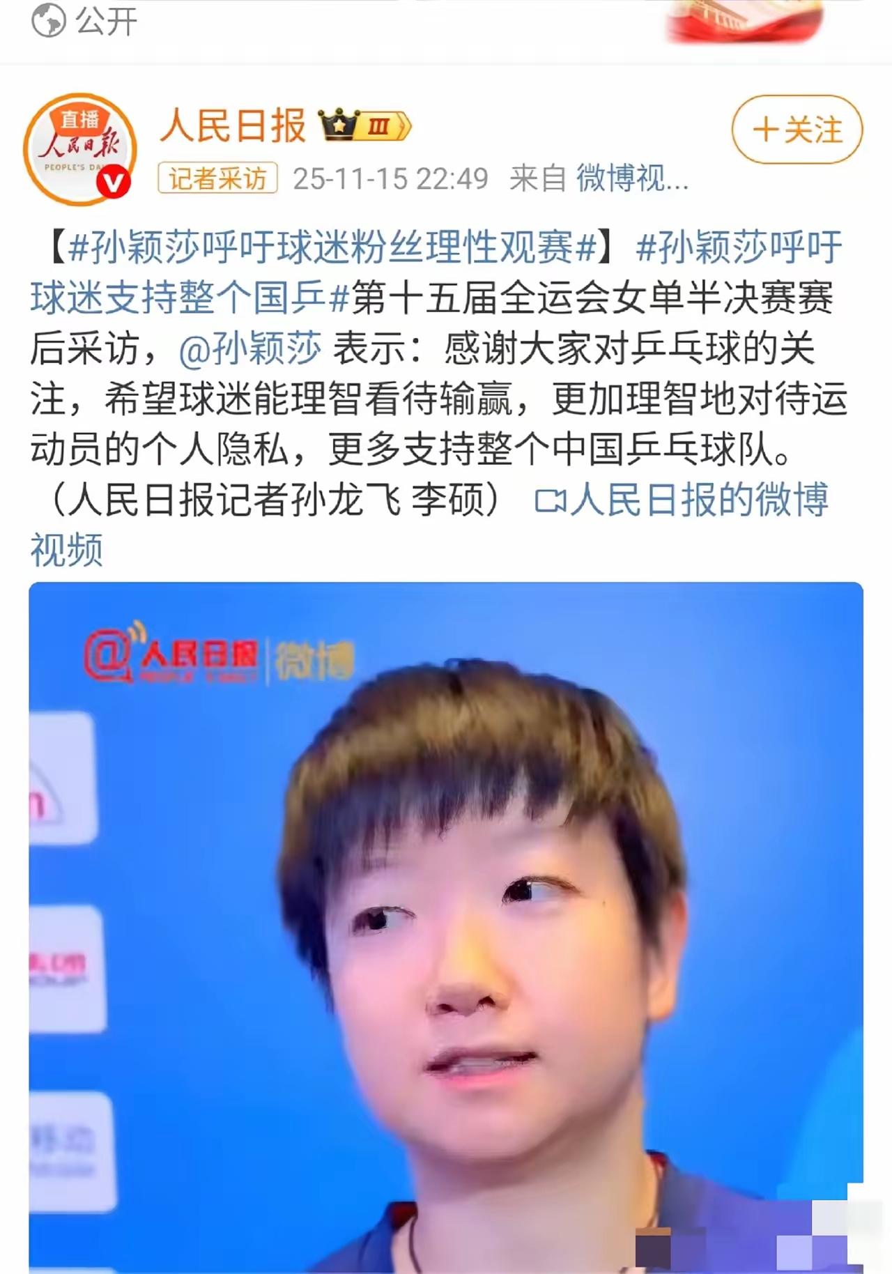 唉,可惜了。 我也是莎莎的粉,一直盼望着她能夺金。她输了,我一个晚上睡不好,更没有心情写东西。 孙颖莎很想要冠军。因为在她乒球生涯中,所有冠军中分量最重的两枚金牌,都从她手指缝中失去。 去年是奥运金牌,今年是全运会金牌。 再往前四年,也是如此。 四年等一回!人生有几个四年?何况还是运动员! 既生瑜何生亮,孙颖莎叹,粉丝也叹!