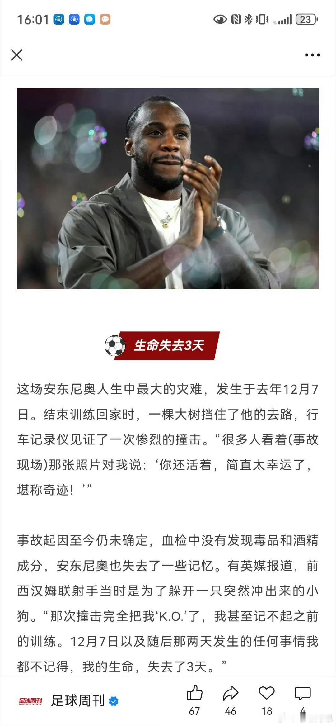卧槽,我说为啥安东尼奥突然没声音了,原来这么严重的车祸,能恢复过来是真不容易。想想豪门流量是大,如果是BIG6球队,就不断会有相关新闻,也不至于我一年后才知道。