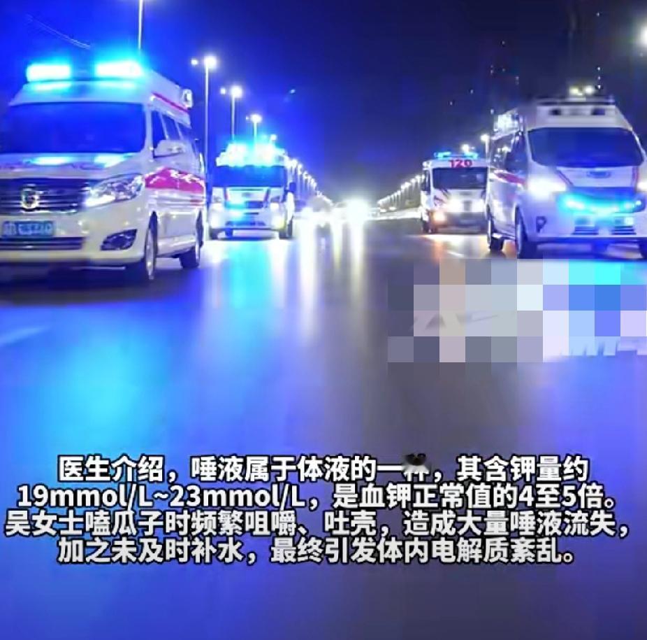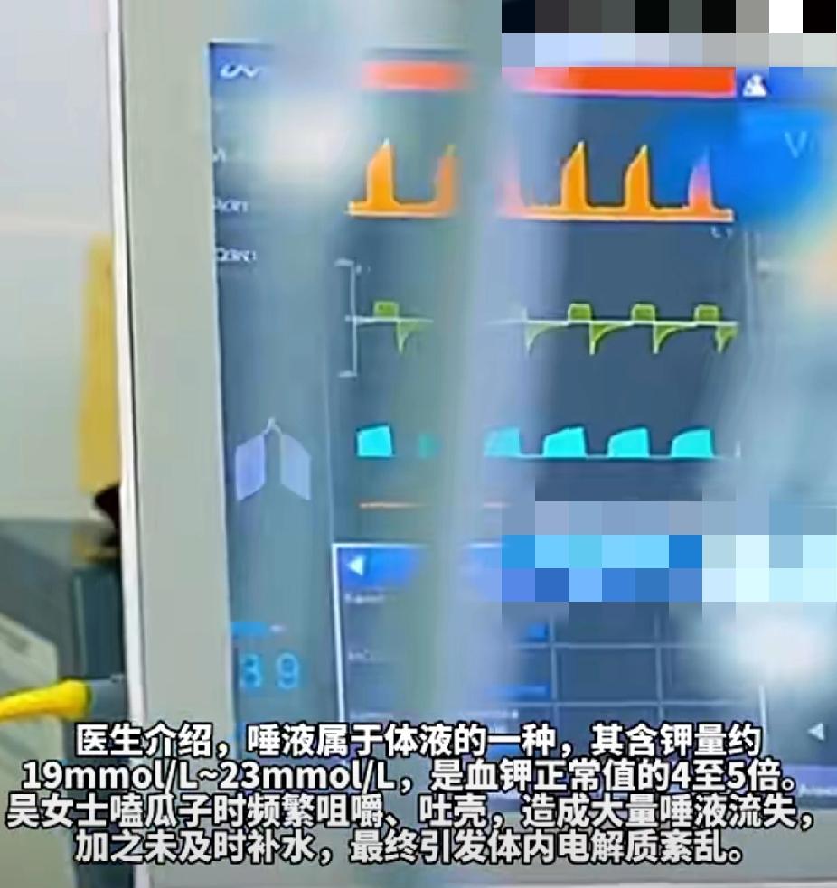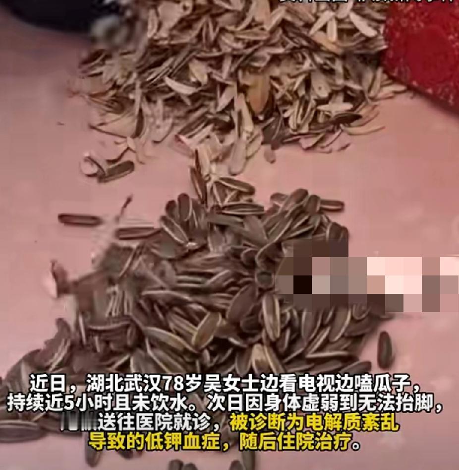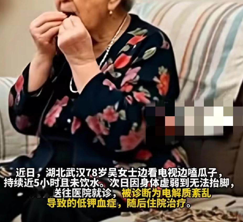 嗑瓜子的风险你知道吗?近日,湖北武汉78岁吴女士连续五小时嗑瓜子不喝一口水,第二天虚弱到脚都抬不起来,紧急送往医院后确诊为电解质紊乱导致的低钾血症! 嗑瓜子是一件非常惬意的事情,很多人都喜欢。但大部分人在嗑瓜子时会感觉口渴,需要不断的喝水缓解,否则会感觉口渴难耐! 然而,唾液的含钾量是身体正常含钾量的4-5倍,而嗑瓜子频繁咀嚼、吐壳会带走大量的唾液,导致身体缺水,电解质紊乱,就会出现吴女士这种情况。 所以,嗑瓜子是有一定风险的,一定要限量吃,并及时补充水分哦! 嗑瓜子的风险