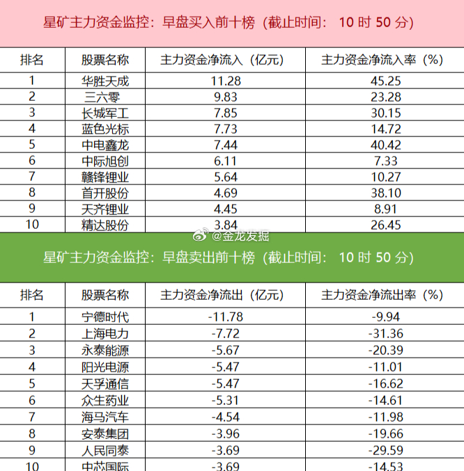 【主力资金监控:华胜天成净买入超11亿】今日早盘主力资金净流入计算机、国防军工、电子等板块,净流出电新行业、银行、食品饮料等板块,其中电新行业净流出超65亿元。个股方面,华胜天成涨停,主力资金净买入超11.22亿元位居首位,中科曙光、中国软件、浪潮信息获主力资金净流入居前;宁德时代遭净卖出超9亿元,贵州茅台、招商银行、比亚迪主力资金净流出额居前。