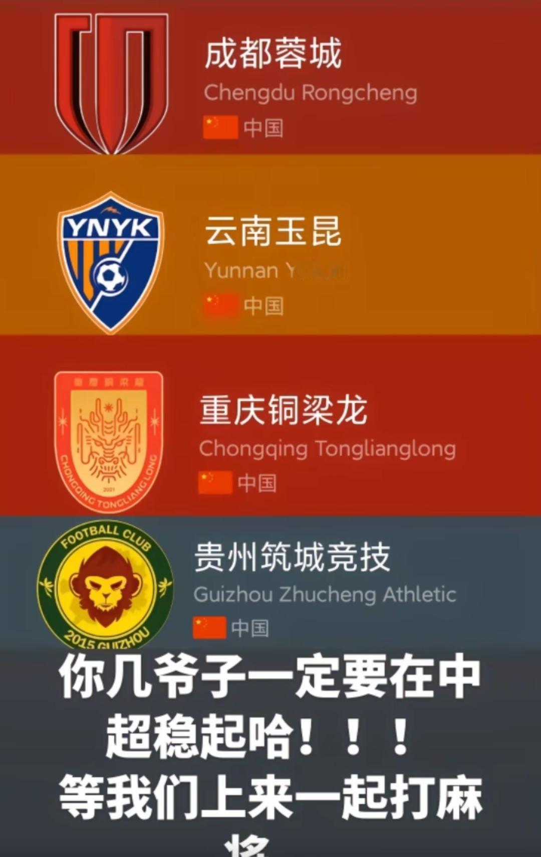 贵州我们在中超等你!西南折耳根联盟的F4组合,目前就只有贵州没有中超球队了,今年云南玉昆和成都蓉城球迷已经打了个样,明年重庆铜梁龙也加入进来了,现在就等贵州来了,那样西南F4折耳根联盟球迷就不是三缺一了。