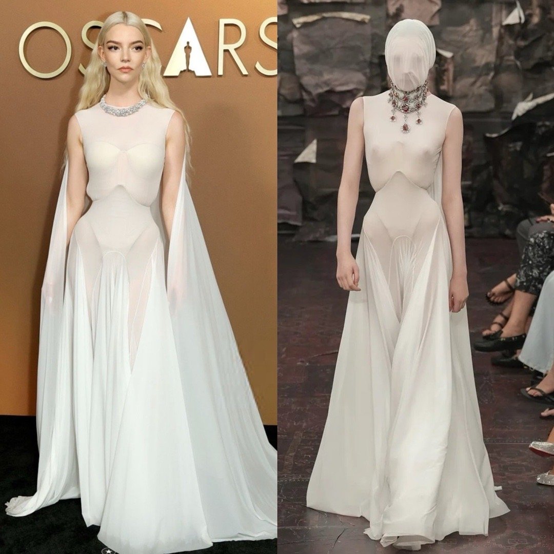 Anya Taylor Joy 亮相奥斯卡理事会奖,红毯上穿了一条Maison Margiela的礼服裙,佩戴蒂凡尼的项链,整个人白到发亮!