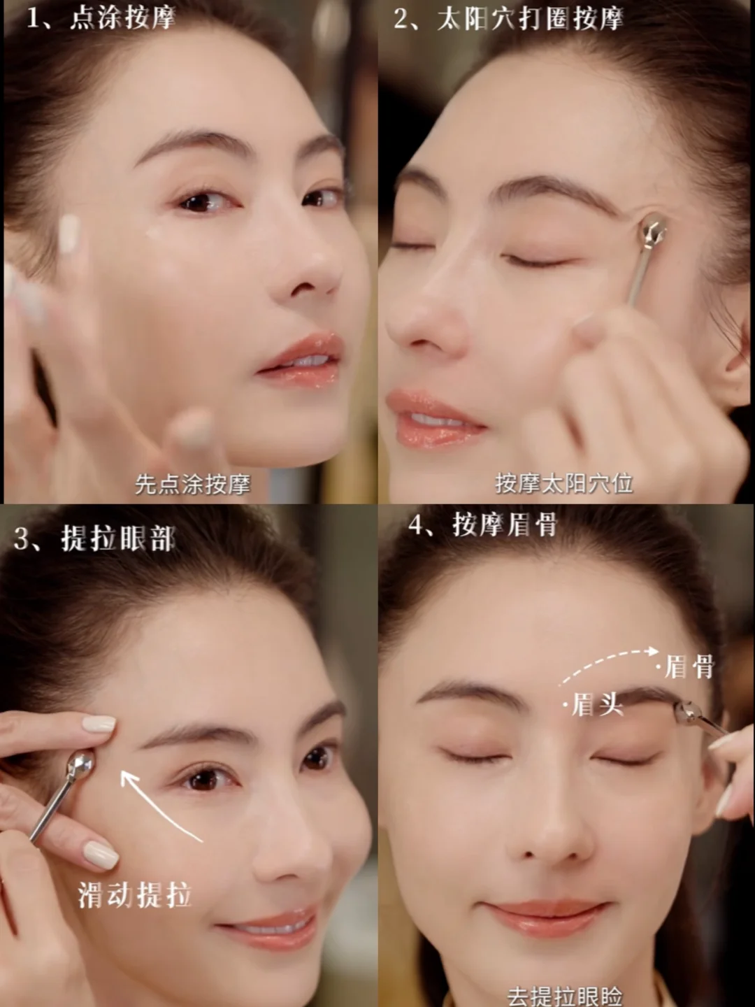 敲黑板❗️❗️姐的眼部按摩手法也给大家整理了,码住来学先把眼霜点涂在眼周按摩棒太阳穴打圈按摩用按摩棒从眼下向上,提拉紧致用按摩棒从眉头到眉骨再按摩一圈