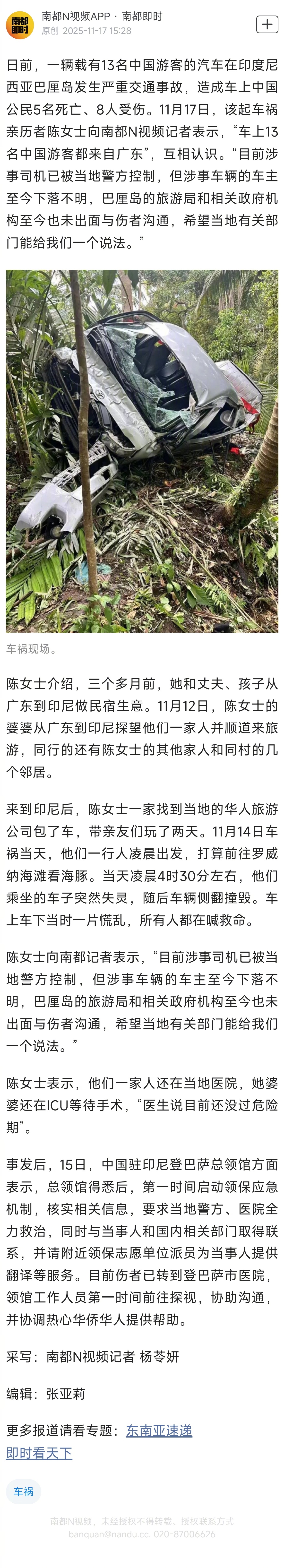【:车主下落不明,还没给个说法】日前,一辆载有13名中国游客的汽车在印度尼西亚巴厘岛发生严重交通事故,造成车上中国公民5名死亡、8人受伤。11月17日,该起车祸亲历者陈女士向南都N视频记者表示,“车上13名中国游客都来自广东”,互相认识。“目前涉事司机已被当地警方控制,但涉事车辆的车主至今下落不明,巴厘岛的旅游局和相关政府机构至今也未出面与伤者沟通,希望当地有关部门能给我们一个说法。”