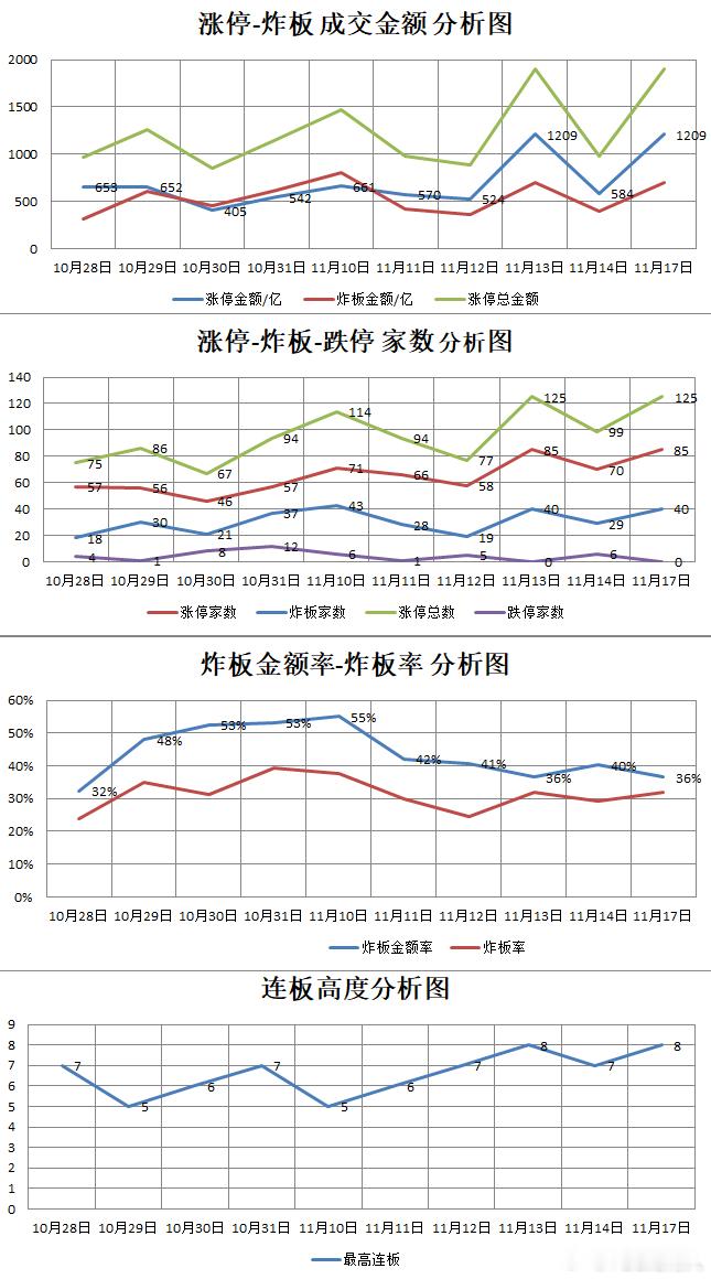 【11.17星期一】 湖南人涨停复盘 "涨停金额:1051亿 炸板金额:310亿首板金额:832亿 连板金额:219亿涨停85家 炸板25家 跌停4家首板60家 连板25家" 【市场连板股】25只 219亿 代码 名称 末次时间 连板数 原因002083 孚日股份 9:25 8 锂电池000632 三木集团 14:43 7 福建600829 人民同泰 10:33 6 医药000407 胜利股份 9:25 5 公告600408 安泰集团 14:53 5 煤炭003041 真爱美家 9:31 4 大消费601566 九牧王 9:33 4 福建002682 龙洲股份 9:25 3 福建000592 平潭发展 9:25 3 福建600340 华夏幸福 9:25 3 地产001203 大中矿业 10:13 3 锂电池002805 丰元股份 13:48 3 锂电池000547 航天发展 9:25 2 福建000798 中水渔业 9:25 2 水产603366 日出东方 9:25 2 名字概念603353 和顺石油 9:25 2 公告002198 嘉应制药 9:30 2 医药002593 日上集团 9:30 2 福建600327 大东方 9:30 2 名字概念300560 中富通 9:33 2 福建001216 华瓷股份 9:43 2 大消费000620 盈新发展 10:09 2 存储600403 大有能源 10:09 2 煤炭000566 海南海药 11:27 2 医药301150 中一科技 14:48 2 锂电池【福建】19只 188亿 消息面:人民日报:台湾光复昭示祖国必定统一 000632 三木集团 14:43 7/11天8板 福建自贸区601566 九牧王 9:33 4 男裤(福建)002682 龙洲股份 9:25 3 现代物流(福建龙岩)000592 平潭发展 9:25 3/22天14板 福建000547 航天发展 9:25 2 商业航天(福建)002593 日上集团 9:30 2 福建300560 中富通 9:33 2 福建000797 中国武夷 9:30 1/3天2板 福建国资600815 厦工股份 9:43 1/10天5板 厦门国资300427 红相股份 9:53 1 军工(福建)603909 建发合诚 10:15 1 厦门国资002474 榕基软件 10:48 1 福建002512 达华智能 10:49 1 福建000905 厦门港务 10:57 1 福建002639 雪人集团 13:41 1 福建300300 海峡创新 14:06 1 平潭国资000663 永安林业 14:41 1 福建002679 福建金森 14:49 1 福建688195 腾景科技 14:53 1 OCS光学部件+福建【名字概念】5只 28亿 603366 日出东方 9:25 2 名字寓意600327 大东方 9:30 2 名字寓意002205 国统股份 9:43 1 “统一”600506 统一股份 10:04 1 “统一”300659 中孚信息 14:52 1 “孚”字辈【锂电池】16只 350亿 消息面:碳酸锂期货主力合约触及涨停;VC等电解液添加剂价格连续大涨 002083 孚日股份 9:25 8 俘日名字概念+锂电池001203 大中矿业 10:13 3/14天7板 锂矿002805 丰元股份 13:48 3/9天5板 磷酸铁锂301150 中一科技 14:48 2 锂金属负极003027 同兴科技 9:50 1/4天2板 钠电正极材料000695 滨海能源 10:00 1 负极材料688005 容百科技 10:06 1 钠电材料大单000688 国城矿业 10:11 1/6天4板 锂矿000546 金圆股份 10:18 1 碳酸锂002240 盛新锂能 10:51 1/3天2板 锂矿002192 融捷股份 11:17 1/3天2板 锂矿000973 佛塑科技 13:30 1/3天2板 锂电池隔膜002326 永太科技 13:33 1/7天4板 六氟磷酸锂002738 中矿资源 13:48 1 锂矿002497 雅化集团 14:41 1/3天2板 锂矿300390 天华新能 14:44 1 锂电池【人工智能】16只 183亿 消息面:阿里启动“千问”项目;华为将发布AI突破性技术 600410 华胜天成 9:38 1 华为昇腾计算600756 浪潮软件 9:39 1 AI政务000665 湖北广电 9:40 1 短剧+智算中心600156 华升股份 9:42 1 拟收购深圳易信(液冷)003007 直真科技 9:43 1 异构算力001229 魅视科技 9:49 1 AI体感控制调度002927 泰永长征 9:50 1 固态断路器(数据中心)002298 中电鑫龙 10:24 1 华为存储300612 宣亚国际 10:34 1 AI营销603232 格尔软件 10:34 1 量子科技600577 精达股份 10:37 1 参股上海超导688229 博睿数据 10:45 1 合作华为603829 洛凯股份 11:23 1 数据中心605303 园林股份 13:36 1/4天2板 参股云计算平台601360 三六零 14:14 1 AI应用002990 盛视科技 15:00 1 忆阻器【机器人】4只 40亿 600376 首开股份 14:30 1/4天2板 间接投资宇树301261 恒工精密 14:47 1 与智元机器人合资新公司601113 华鼎股份 14:49 1 机器人材料(尼龙)600592 龙溪股份 14:50 1 人形机器人(关节轴承)【医药】4只 37亿 600829 人民同泰 10:33 6 流感+美好愿景002198 嘉应制药 9:30 2 流感治疗000566 海南海药 11:27 2 流感治疗002795 永和智控 9:50 1 肿瘤精准放射治疗【存储】3只 51亿 000620 盈新发展 10:09 2/21天13板 存储芯片封测002208 合肥城建 14:18 1/6天3板 间接参股长鑫科技605178 时空科技 14:24 1 拟收购存储公司【大消费】3只 11亿 003041 真爱美家 9:31 4 毛毯纺织001216 华瓷股份 9:43 2 压电陶瓷002919 名臣健康 9:43 1 死神IP《境·界 刀鸣》【地产】3只 25亿 600340 华夏幸福 9:25 3 城市更新000090 天健集团 14:20 1 房地产开发000036 华联控股 14:44 1 房地产开发【煤炭】3只 63亿 600408 安泰集团 14:53 5/23天14板 煤炭600403 大有能源 10:09 2/5天3板 煤炭000723 美锦能源 14:55 1 煤炭【其他】 000407 胜利股份 9:25 5 公告购买资产603353 和顺石油 9:25 2 公告收购上海奎芯002218 拓日新能 10:27 1 光伏002356 赫美集团 14:25 1 光伏601606 长城军工 9:42 1 军工300589 江龙船艇 14:12 1 军工000798 中水渔业 9:25 2 水产600097 开创国际 11:01 1 水产605399 晨光新材 13:24 1 有机硅【涨停炸板】25只 310亿 代码 名称 首次时间 涨跌幅 原因300405 科隆股份 13:46 16.92% 锂电池688227 品高股份 10:06 11.61% 东数西算/算力002466 天齐锂业 14:19 9.87% 锂电池600773 西藏城投 13:17 9.62% 锂电池300094 国联水产 9:25 9.33% 水产605255 天普股份 11:12 9.27% 股权转让600721 百花医药 10:02 8.63% 医药603977 国泰集团 10:39 8.48% “好名字”600078 澄星股份 9:35 7.55% 磷化工002331 皖通科技 10:02 7.21% 其他603660 苏州科达 10:47 6.94% 东数西算/算力600693 东百集团 9:34 6.36% 福建002398 垒知集团 10:11 6.32% 福建603668 天马科技 9:25 6.16% 水产605288 凯迪股份 9:38 6.13% 机器人600467 好当家 9:25 5.70% 水