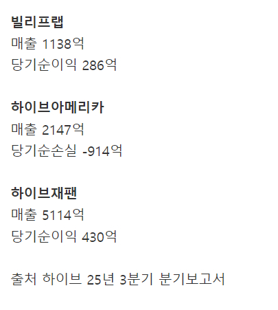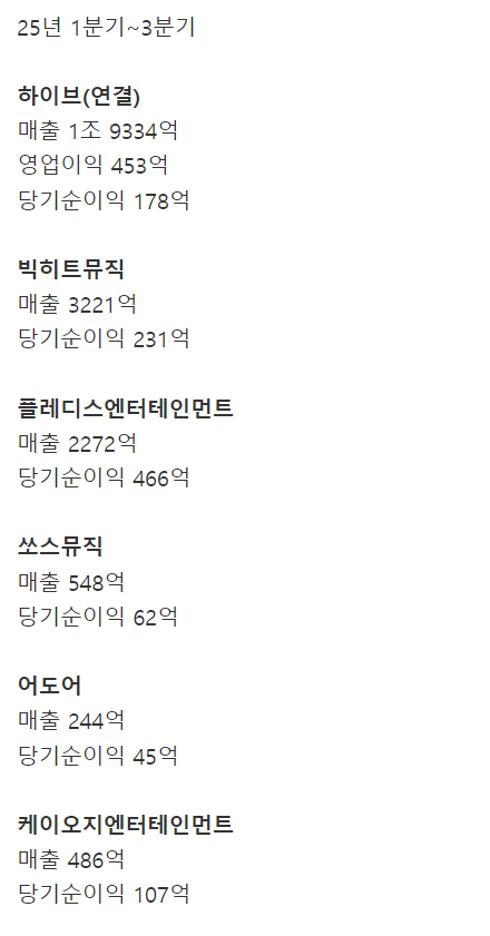 HYBE各厂牌2025年1~3季度实际业绩HYBE销售额:1兆9334亿韩元净利润:178亿韩元BIG HIT销售额:3221亿韩元净利润:231亿韩元Pledis销售额:2272亿韩元净利润:466亿韩元SOURCE MUSIC销售额:548亿韩元净利润:62亿韩元ADOR销售额:244亿韩元净利润:45亿韩元KOZ销售额:486亿韩元净利润:107亿韩元Belift Lab销售额:1138亿韩元净利润:286亿韩元HYBE America销售额:2147亿韩元净利润:-914亿韩元HYBE JAPAN销售额:5114亿韩元净利润:430亿韩元