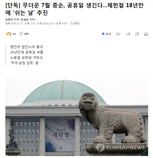 韩国将新增一天公休日17日据韩媒报道,韩国国会行政安全委员会审议并通过了一项“公休日相关法律修订案”,将制宪节重新指定为公休日,如没有特殊情况变更,7月17日制宪节将成为韩国公休日。