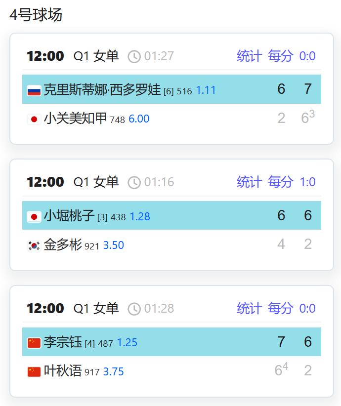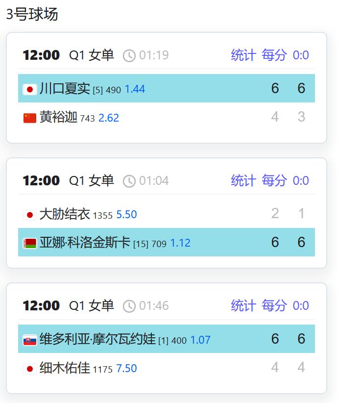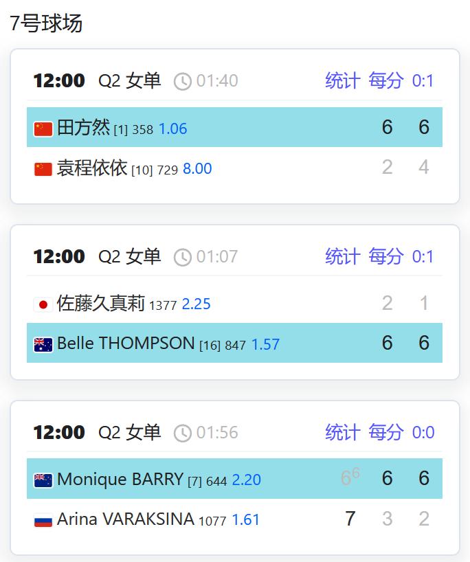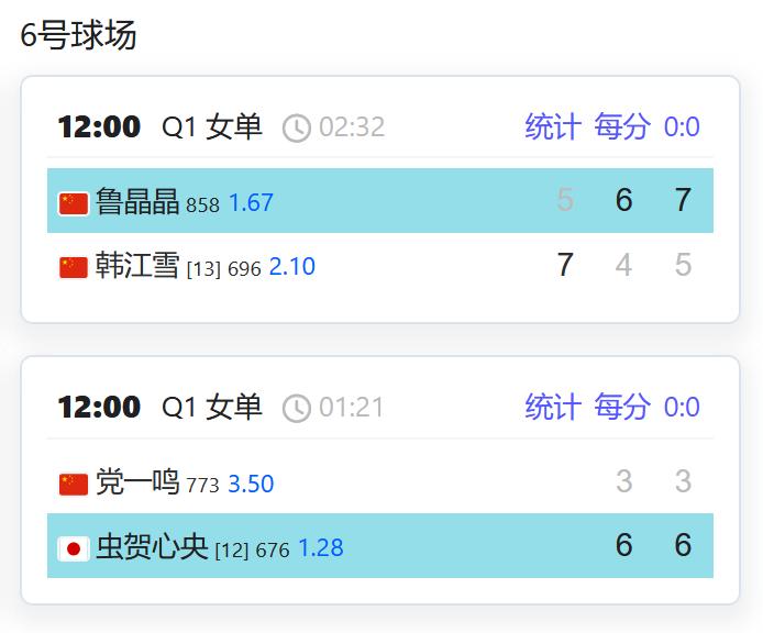赛果: W100高崎,女单资格赛第一轮: 张筠涵6-1,3-6,2-6遭对手川村茉那逆转,无缘晋级; 黄裕迦4-6,3-6不敌5号种子川口夏实; 李宗钰7-6(4),6-2击败叶秋语,晋级下一轮; 老将鲁晶晶2-1逆转韩江雪,同样晋级下一轮; 党一鸣3-6,3-6不敌虫贺心央,止步首轮。 W75悉尼,女单资格赛头号种子田方然6-2,6-4击败袁程依依,晋级正赛。