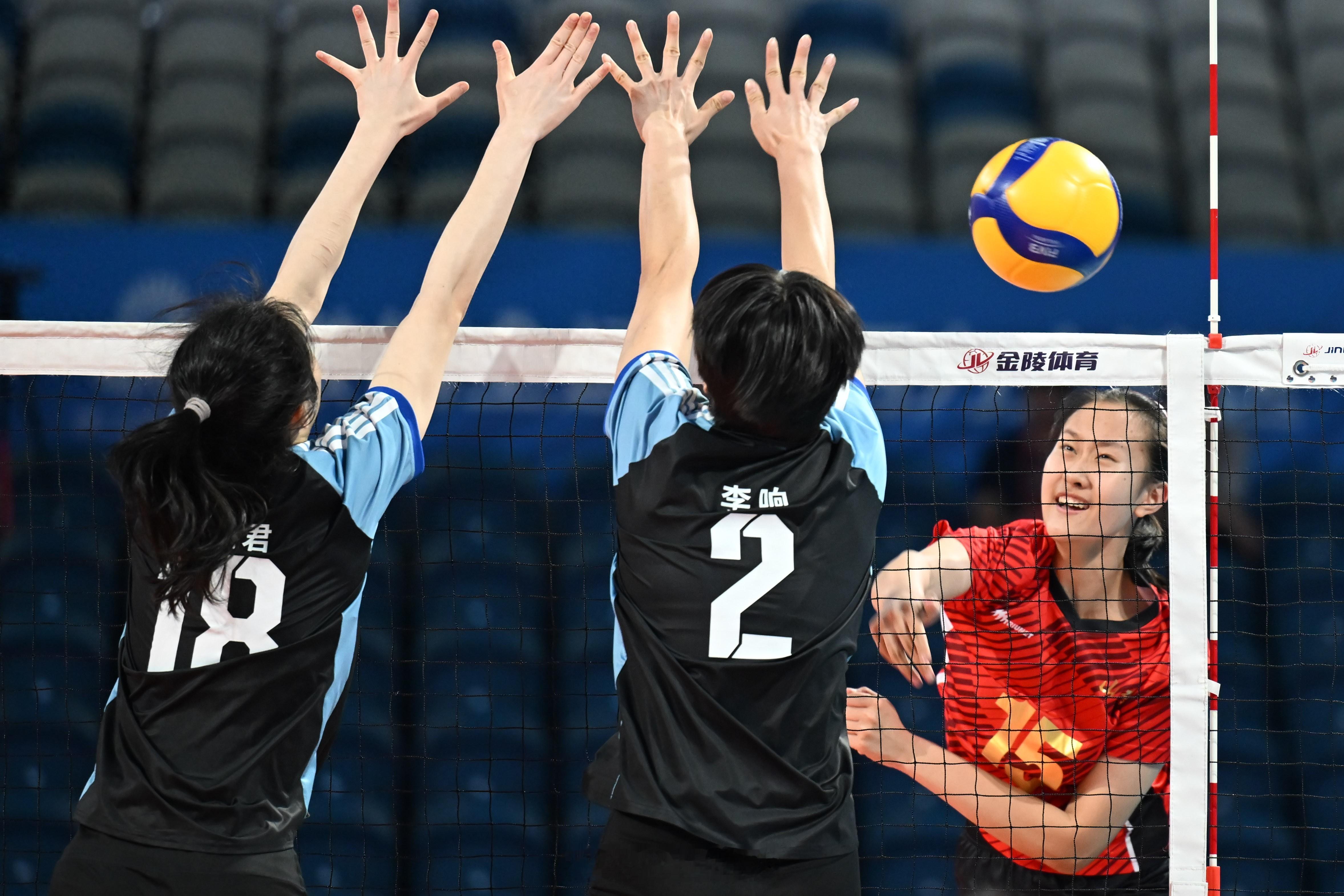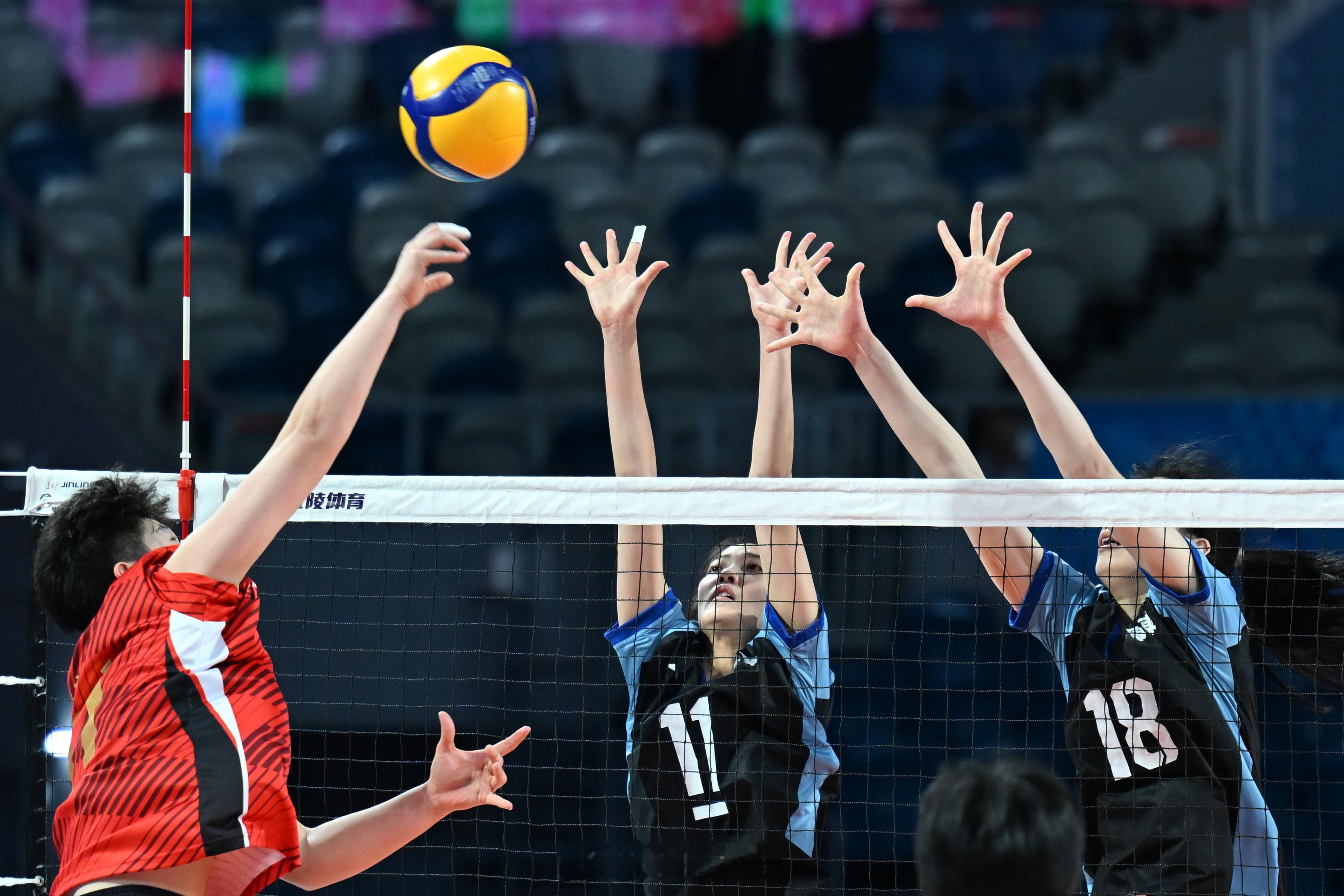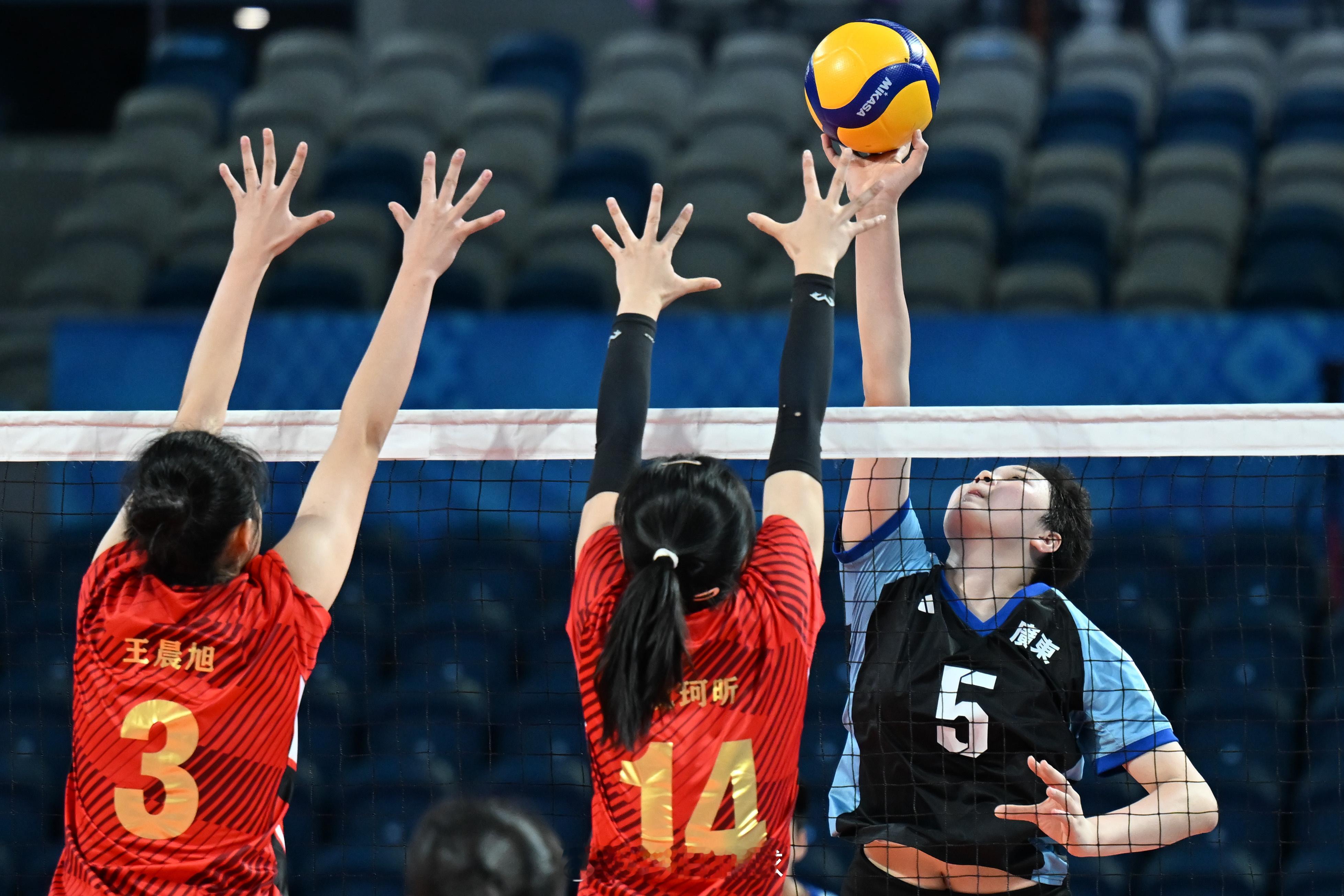 组照:11月17日,在深圳进行的 排球女子18岁以下组5-8名半决赛中,山东队3比1战胜广东队(新华社记者 李志鹏 摄)。