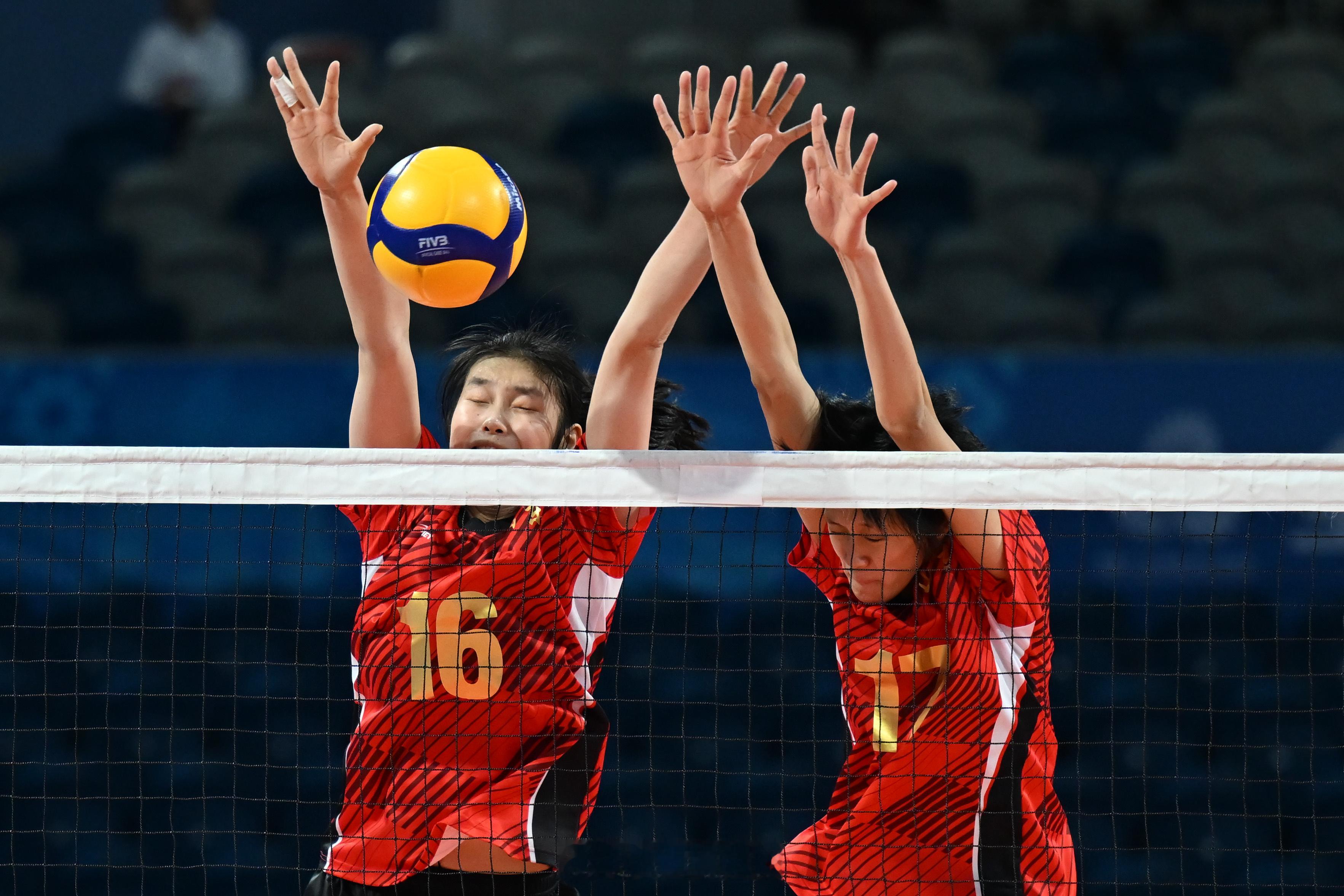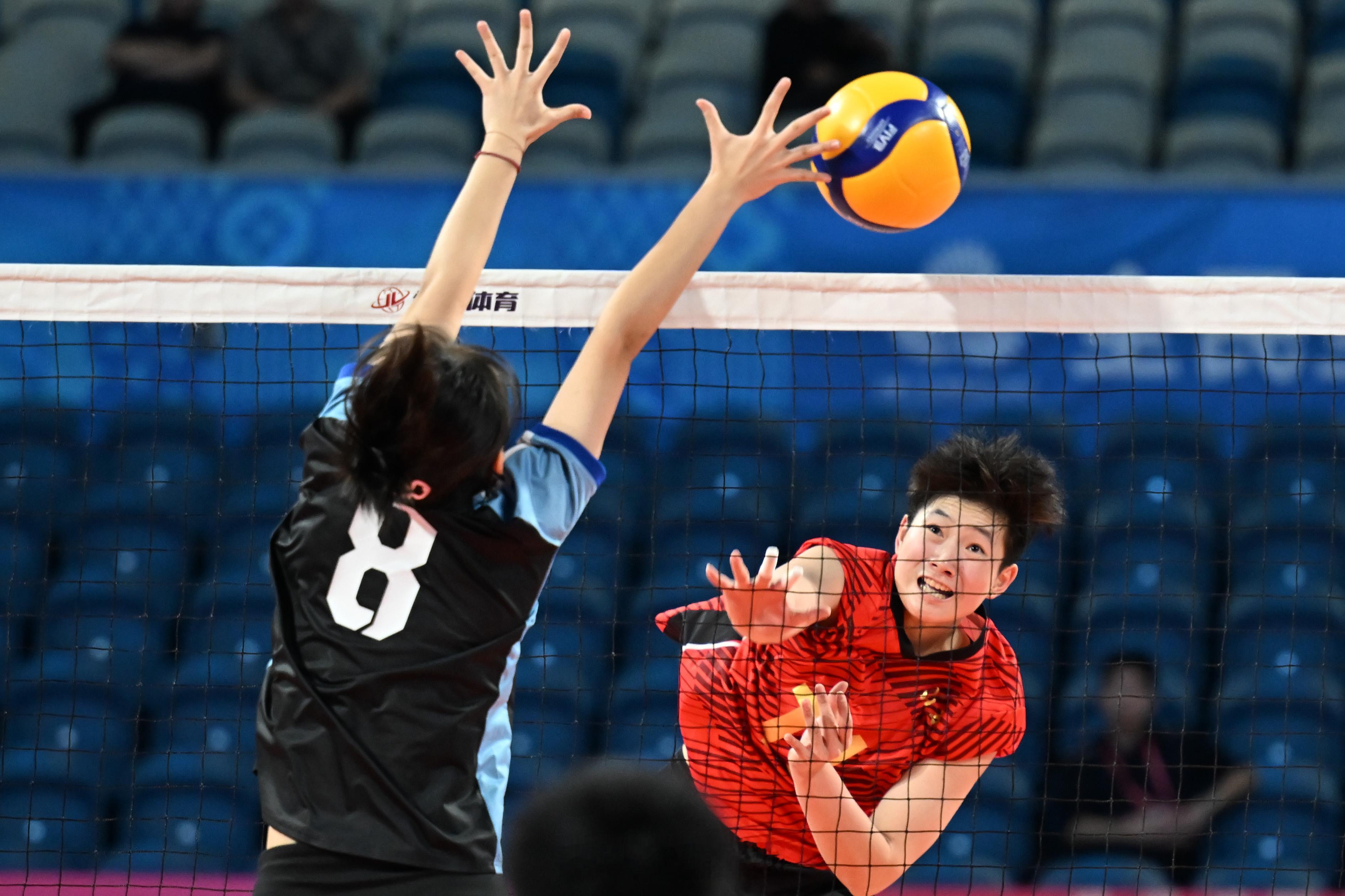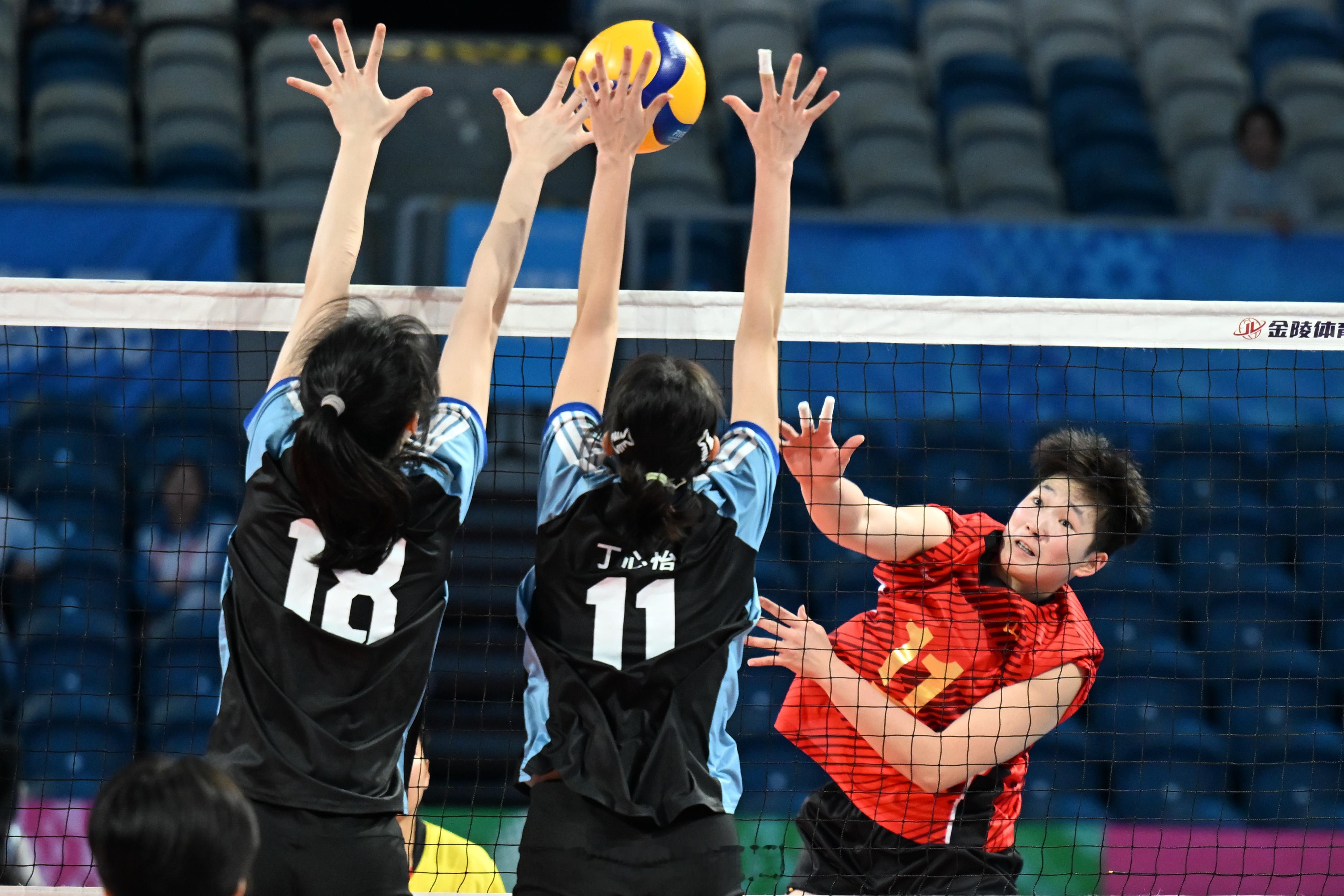 组照:11月17日,在深圳进行的 排球女子18岁以下组5-8名半决赛中,山东队3比1战胜广东队(新华社记者 李志鹏 摄)。