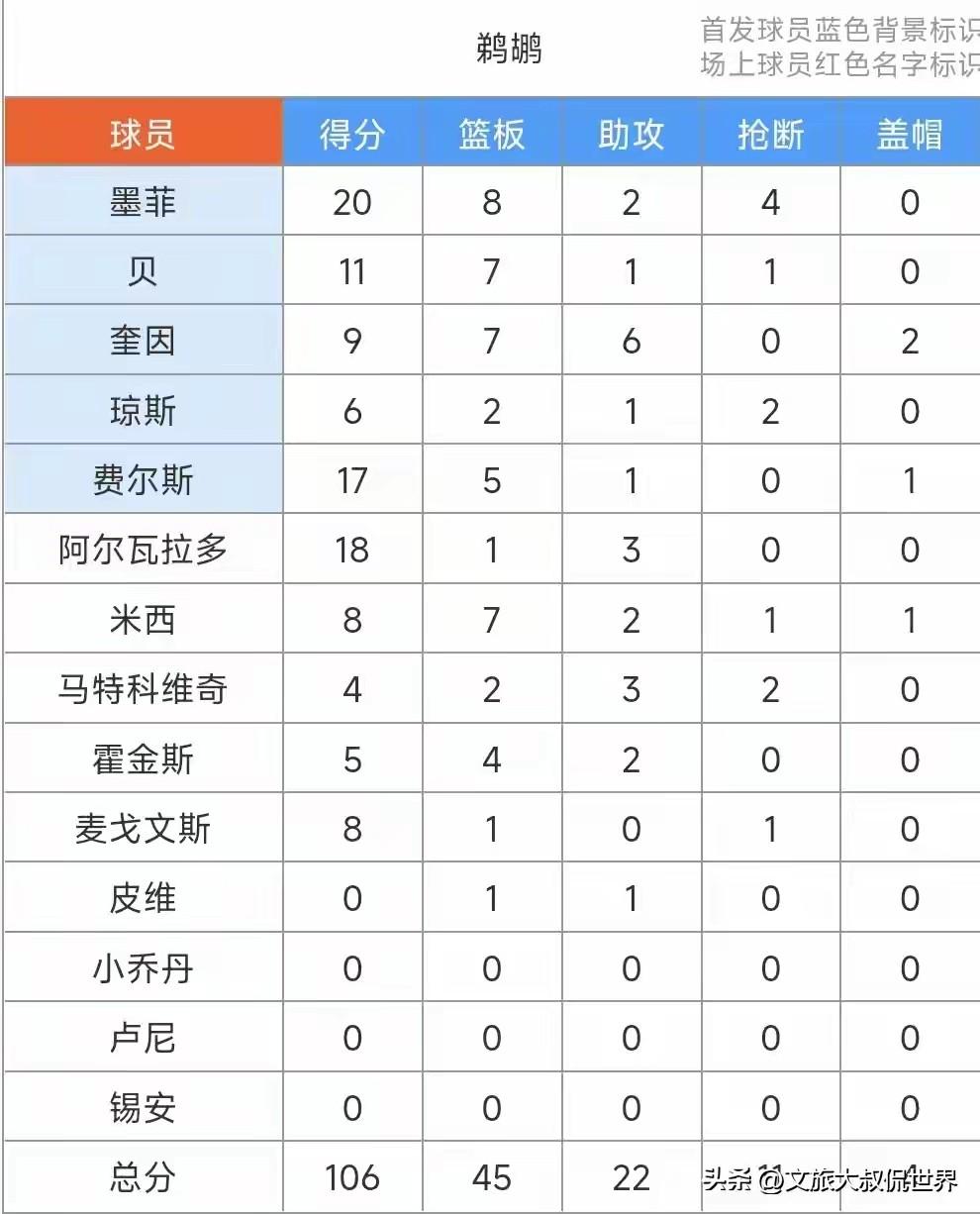 库里成铁匠!穆迪32+4&巴特勒18+10,勇士124-106大胜鹈鹕喜获三连胜。 北京时间11月17日上午8:00NBA常规赛鹈鹕队主场迎战勇士队,首发阵容为费尔斯、赫伯特.琼斯、墨菲、萨迪克.贝、奎因;勇士队首发五虎为斯蒂芬.库里、穆迪、理查德、巴特勒、追梦格林。 第一节开打,赫伯特.琼斯突破上篮得2分,萨迪克.贝补篮添2分,巴特勒回头望月投中2分,墨菲制造犯规罚球两罚全中添2分,穆迪外线手起刀落远射3分飙进,接着继续外线长虹贯日远射3分命中梅开二度。双方陷入混战你来我往首节结束,勇士队44:28领先鹈鹕队16分,穆迪单节爆发砍下21分,三分球8投7中! 第二节继续,奎因博得杀伤罚球两罚一中得1分,墨菲外线小李飞刀模式飙中3分,鹈鹕队连得4分追到32:44。波斯特罚球两罚一中得1分,墨菲怒发冲冠暴扣再来2分。双方你追我赶杀的热火朝天,上半场结束鹈鹕队49:61落后勇士队12分,库里半场6投0中依靠罚球得到3分。 上半场双方数据统计: 下半场易边再战!勇士队穆迪、巴特勒、波杰姆斯基三个火枪手轮换轰炸得分,率队稳扎稳打处于领先,库里陷入打铁模式!鹈鹕队墨菲、阿尔瓦拉多、萨迪克.贝等人也是先后发力奋起直追,无奈比分相差太大!最终一番厮杀比赛结束,勇士队124:106轻松击败鹈鹕队喜获三连胜,同时送鹈鹕队五连败!库里全场11投2中铁的一塌糊涂,仅仅得到9分5篮板3助攻1盖帽。