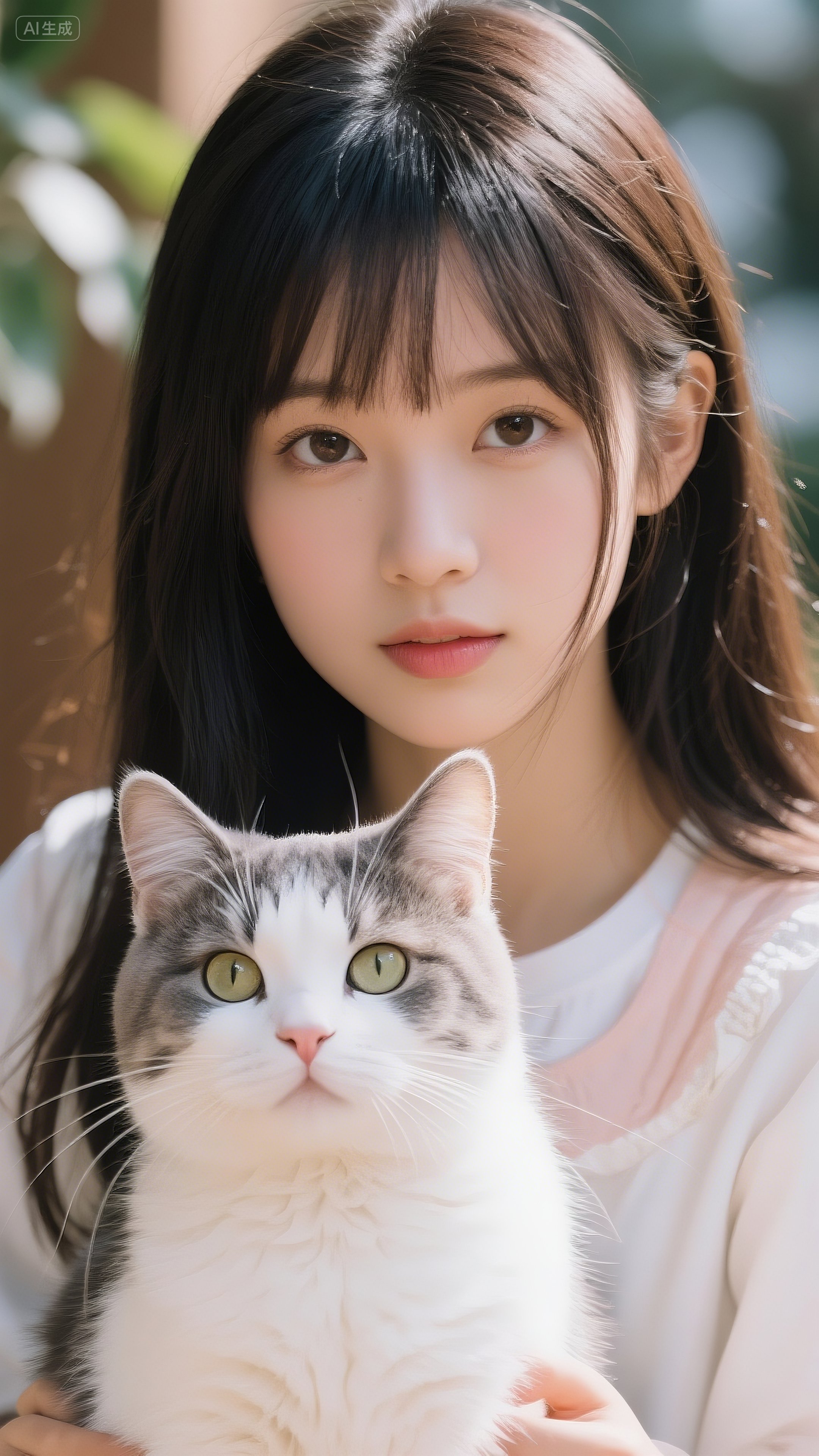 冷艳黑发女孩,温柔抱猫,静谧夜晚。